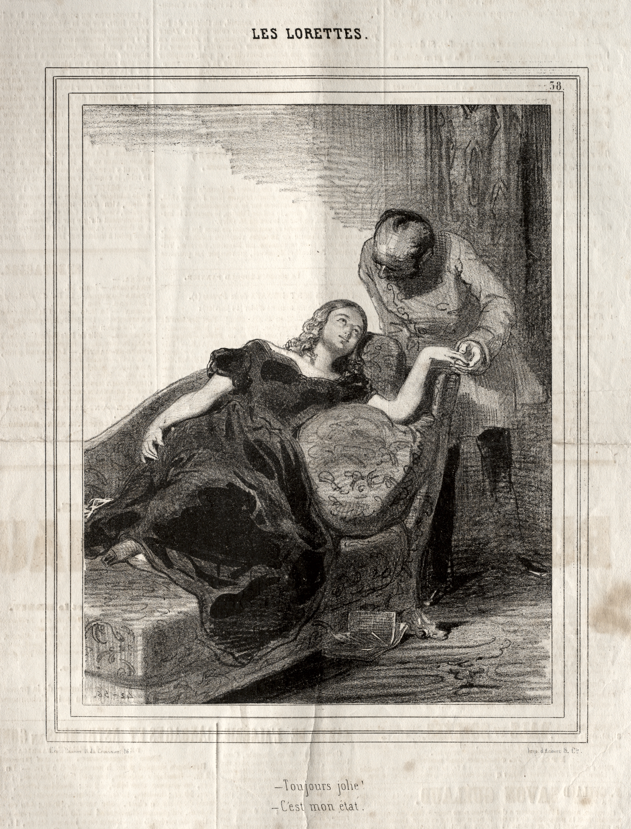 Black and white illustration of a woman reclining on a low chair. The woman's head is thrown back, and she has one arm resting on her stomach and the other on the back of the chair. She wears a dark dress and appears to have curled hair. A man stands over her, his head bowed and hand extended toward her. He wears a hat and a light-colored jacket or shirt. The scene is framed by a thin double-lined border. Above the image, the text reads "LES LORETTES". The background of the illustration is a light-colored wall. Text appears below the image on the aged paper. The illustration is by Paul Gavarni.