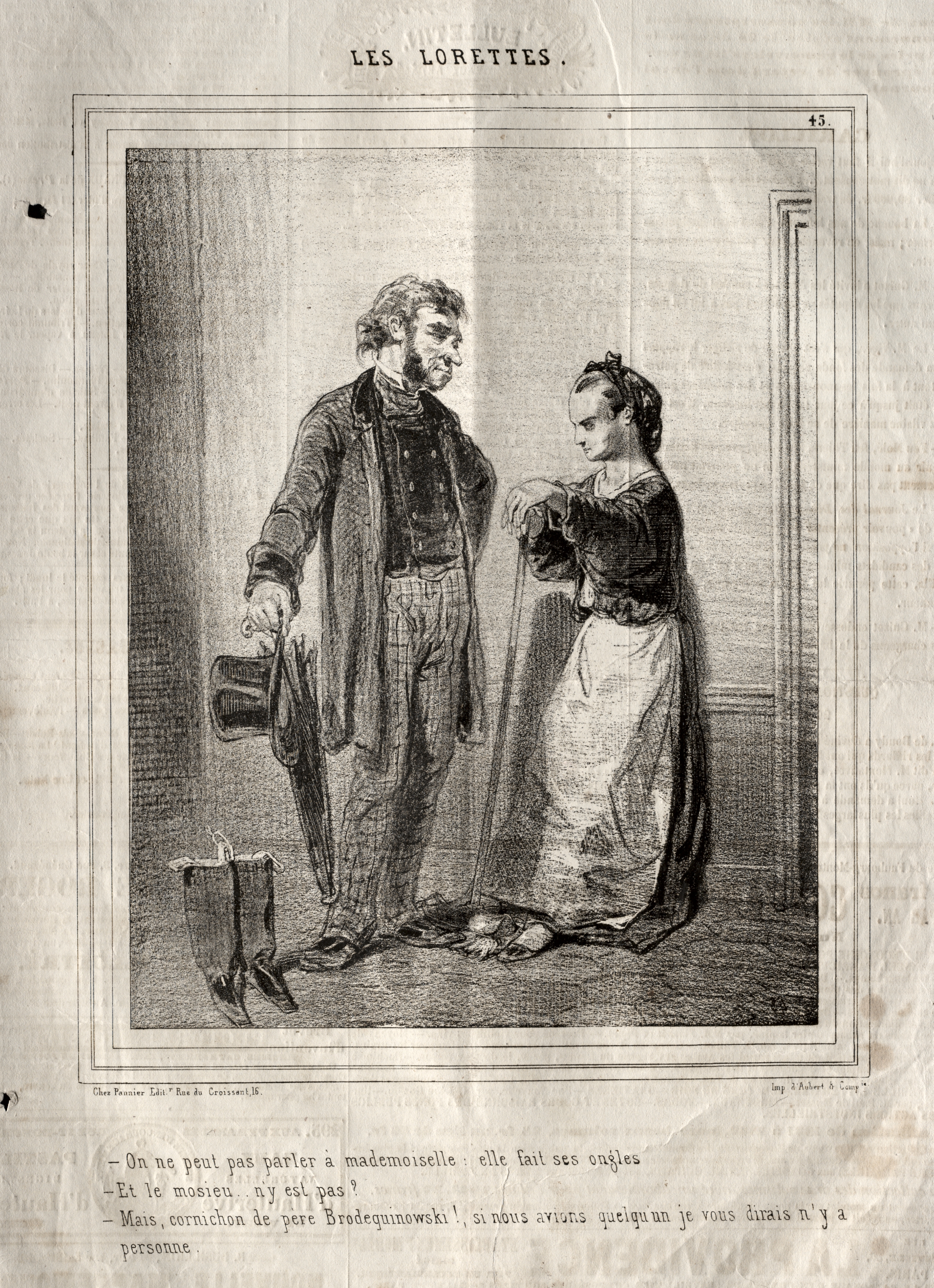Black and white illustration of a man and a woman indoors. The man is on the left, wearing a dark jacket, vest, and pants. He has curly hair and a beard. His right hand holds a top hat, and his left hand holds a coat. A boot sits on the floor to his left. The woman is on the right, wearing a dark long-sleeved top and a long white skirt. She has her hair pulled back and is looking down, holding a curtain or dress with both hands. The background has a wall with molding on the right and a curtain on the left. Text is at the top of the image and below the illustration.