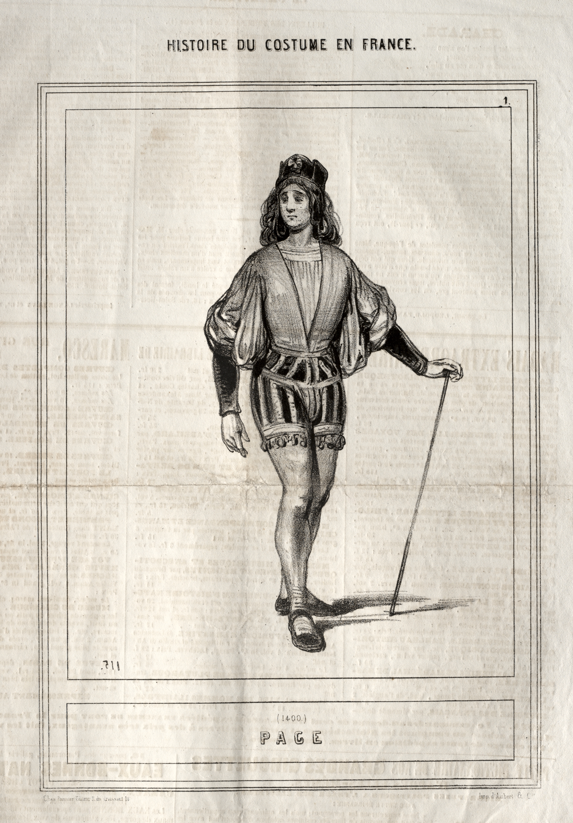 The image shows a black-and-white illustration of a man in 15th-century clothing. The man has long, wavy hair and wears a hat on top of his head. His outfit consists of a loose-fitting top with puffy sleeves and a V-neck, paired with short shorts featuring vertical stripes and a decorative trim along the hem. He also wears low-heeled shoes. The man holds a cane in his right hand, with his left arm relaxed by his side. He stands with his left leg slightly bent and his right leg straight. The illustration is framed by two thin rectangular borders, with text at the top reading "HISTOIRE DU COSTUME EN FRANCE." Below the illustration, within the inner border, is the text "(1400) PAGE." The background of the image appears to be aged paper with faint text, suggesting it may be a page from a book titled "Historique du Costume en France" by Paul Gavarni.