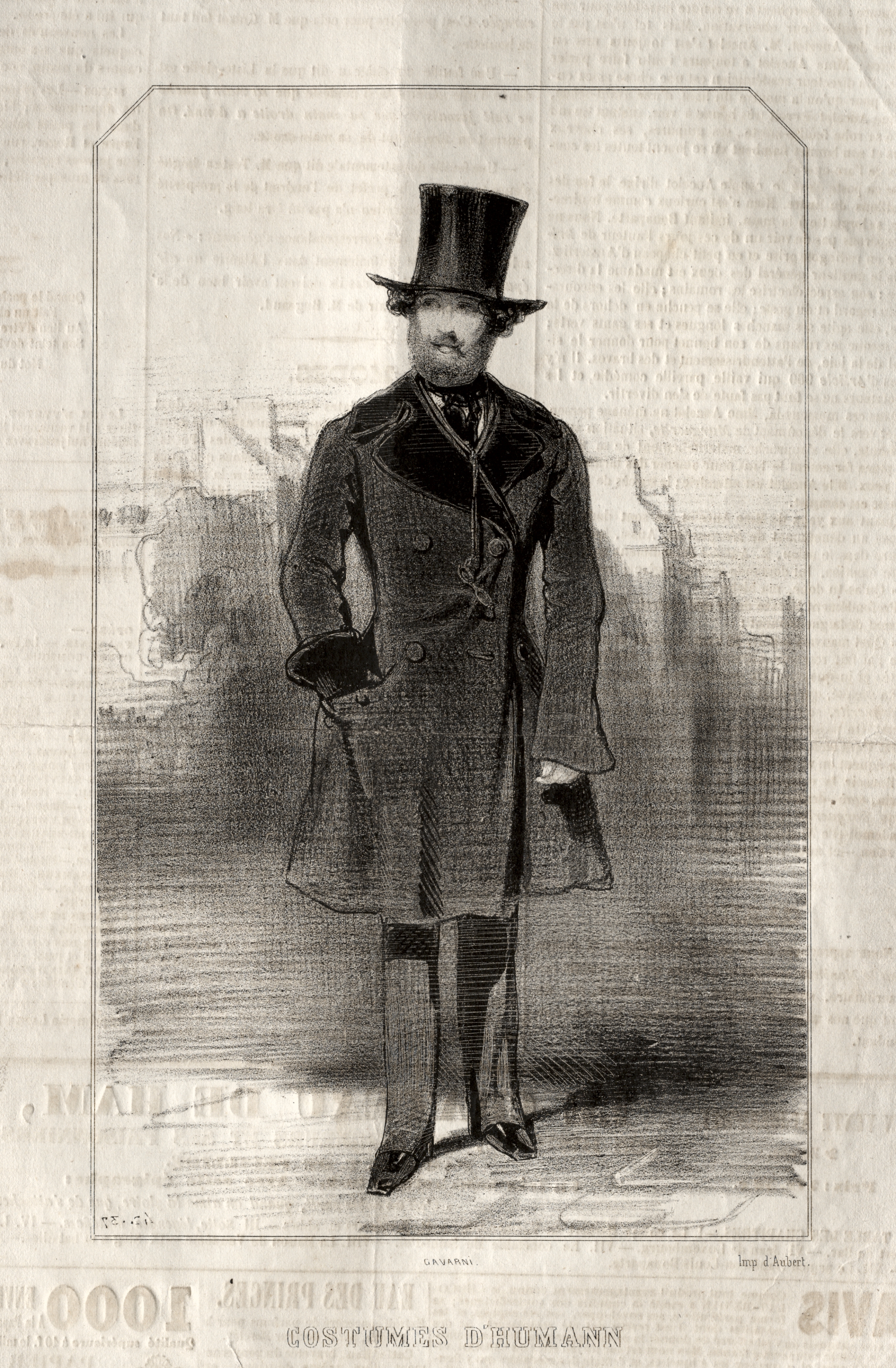 Black and white illustration of a man wearing a long dark coat with tails at the back, dark trousers, and a tall top hat; his right hand is in his coat pocket. The man has a mustache. He is standing in front of a cityscape background. The text at the bottom reads "Costumes d'Humann".