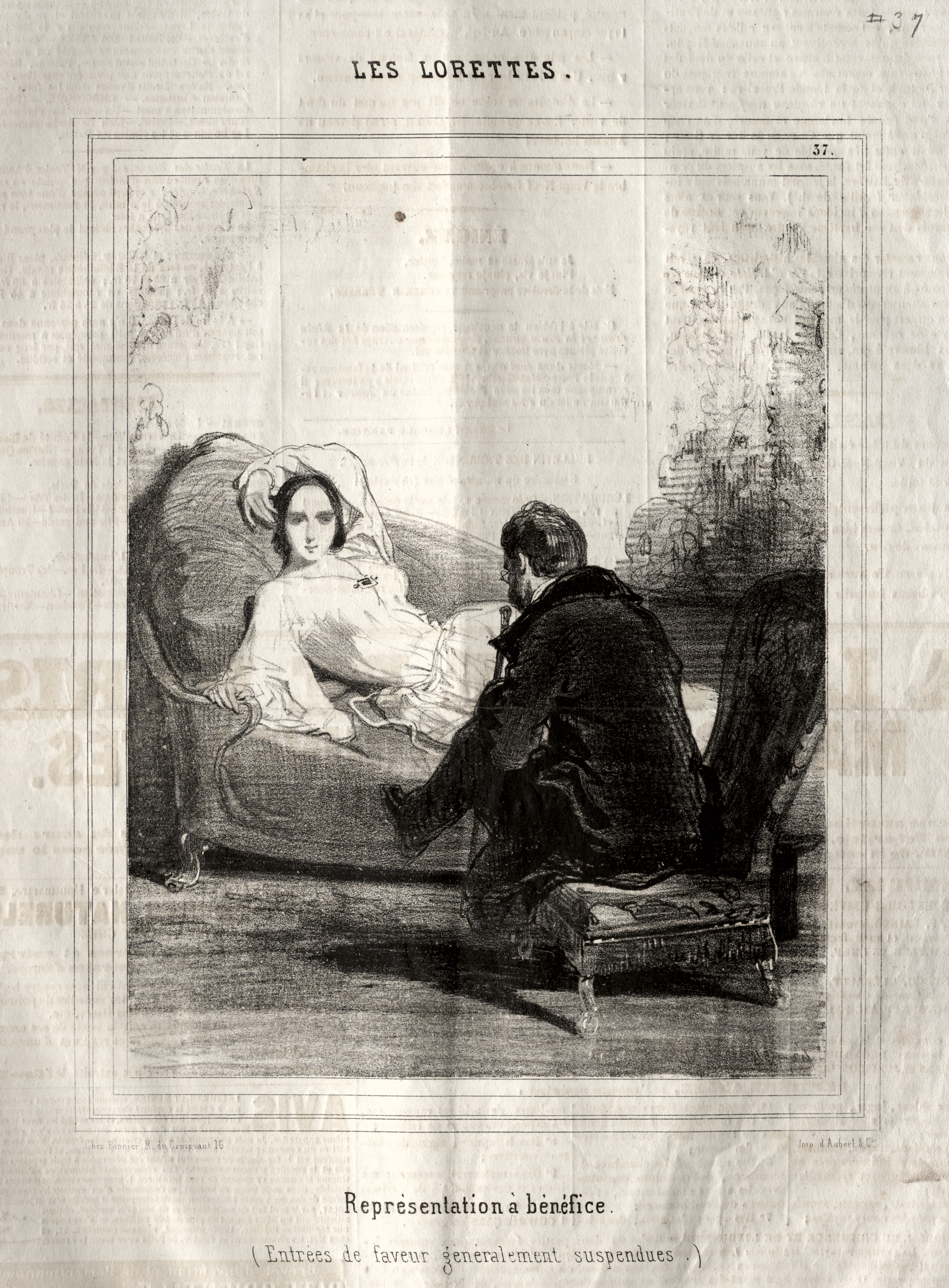 Black and white drawing of a woman reclining on a chaise longue and a man sitting on a stool. The woman wears a low-cut white dress with puffy sleeves. She has her left arm raised to her head. The man wears a dark jacket and pants. He sits with his back to the viewer, his right leg crossed over his left. The background shows a curtained wall. The image is framed by a rectangle with a caption below: "Representation a benefice. (Entree de faveur generalement suspendues)". The image title "Les Lorettes" appears above.