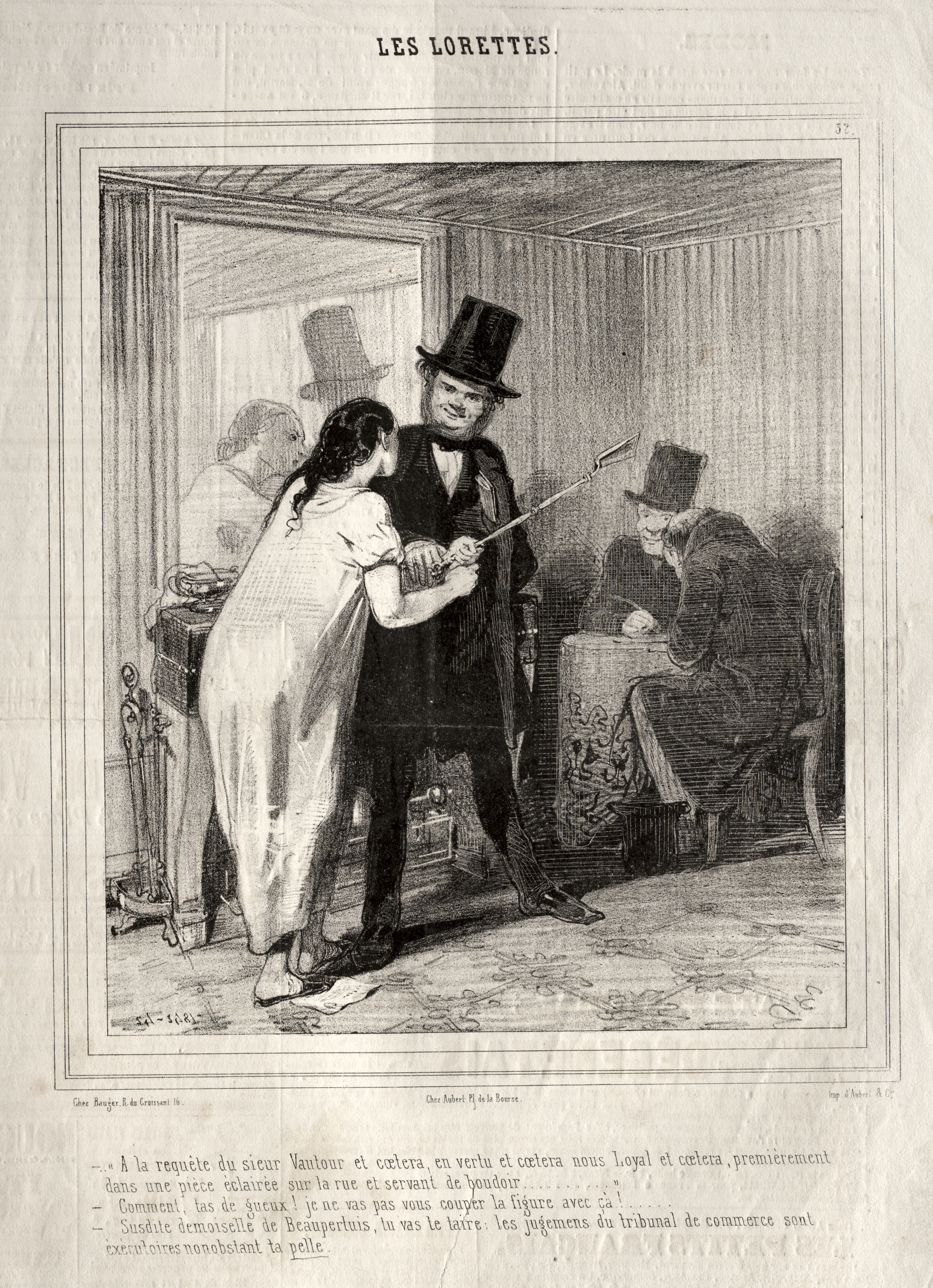 Black and white illustration of a man in a top hat and suit holding a whip, standing next to a woman in a white dress. The woman is turned away from the man. A man sits at a table to their right. The background features a curtained window. The text "Les Lorettes" appears at the top. The illustration style is detailed and realistic. The image is framed by a thin border.