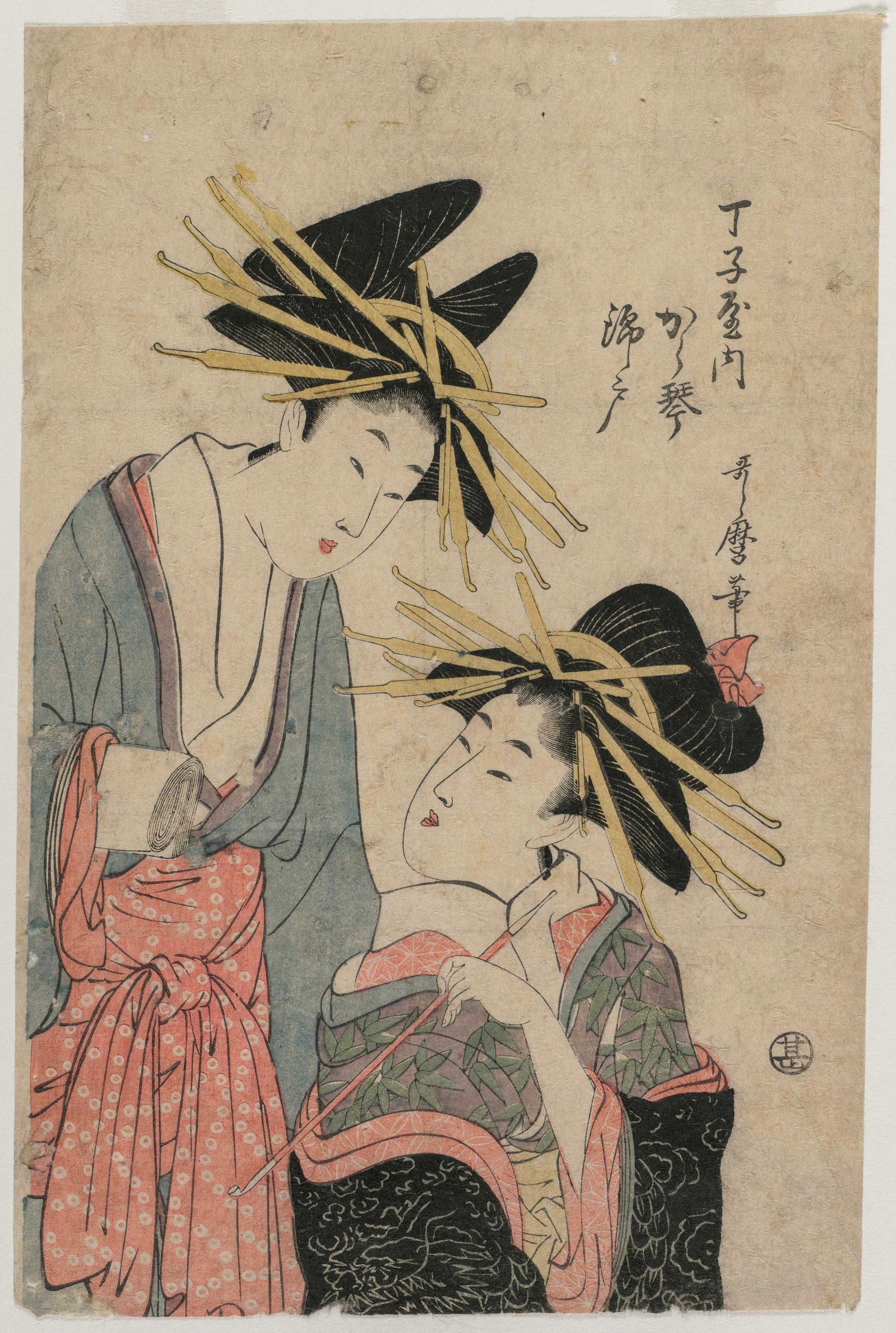 The image depicts a Japanese woodblock print of two women. The woman on the left is taller and wears a blue robe over a pink kimono with a white pattern; she looks down. The woman on the right sits and wears a green kimono with a pink lining and a black skirt with a gold pattern; she looks up. Both women have black hair styled in buns adorned with long, thin, light-brown sticks and pink flowers. The seated woman's kimono sleeves and the standing woman's kimono sleeve are folded back. Both women have pink lips and rouge on their cheeks. The background is beige with some darker spots and Japanese writing on the right side. A circular symbol is on the bottom right.