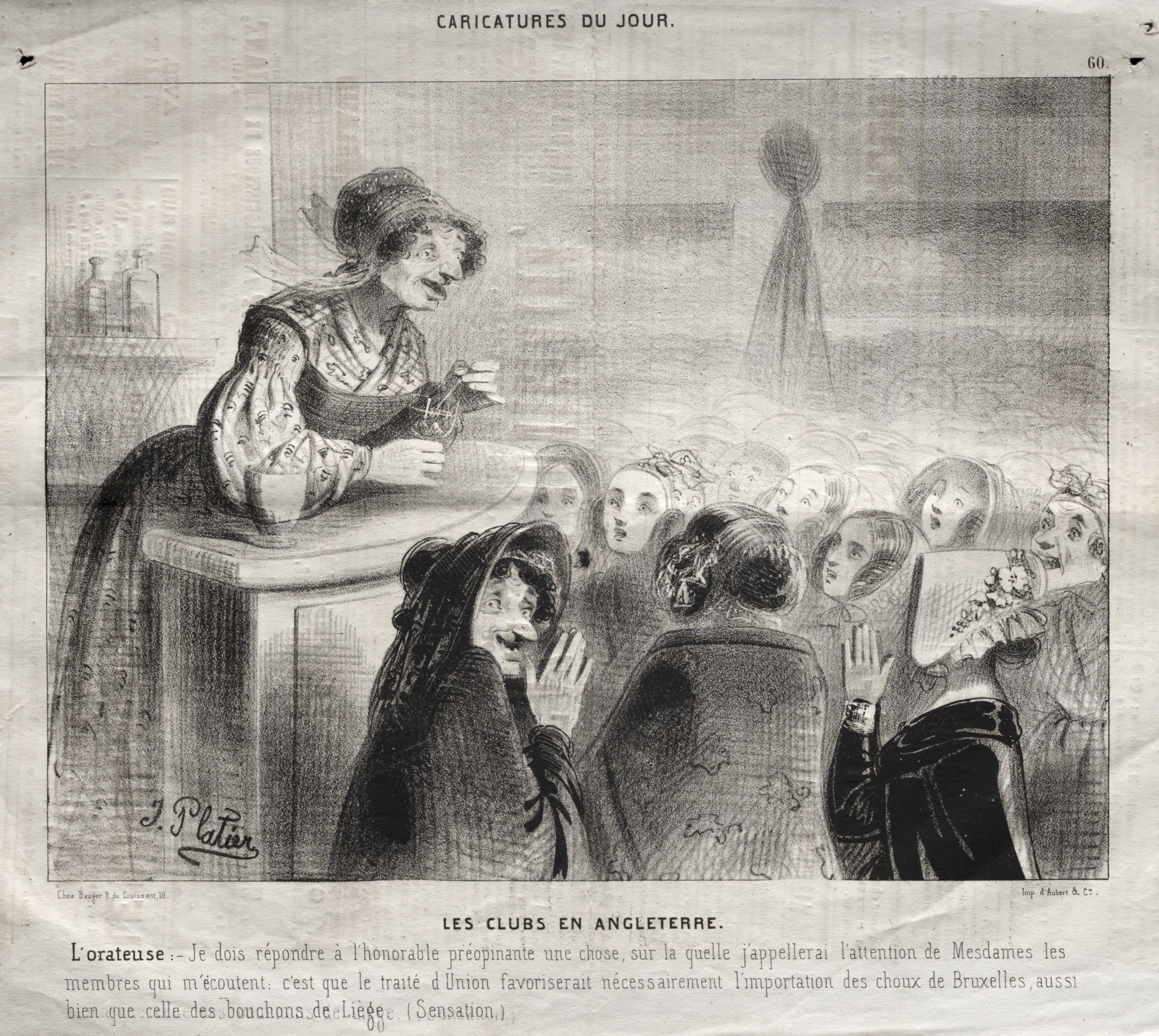 Black and white drawing of woman standing at a podium addressing an audience of mostly women. The woman at the podium wears a hair covering and a dress with billowy sleeves. She holds a cup and saucer. Two women seated to the right have their hands raised. A caption reads "LES CLUBS EN ANGLETERRE" and the artist's signature appears at the bottom left. A decorative header reads "CARICATURES DU JOUR".