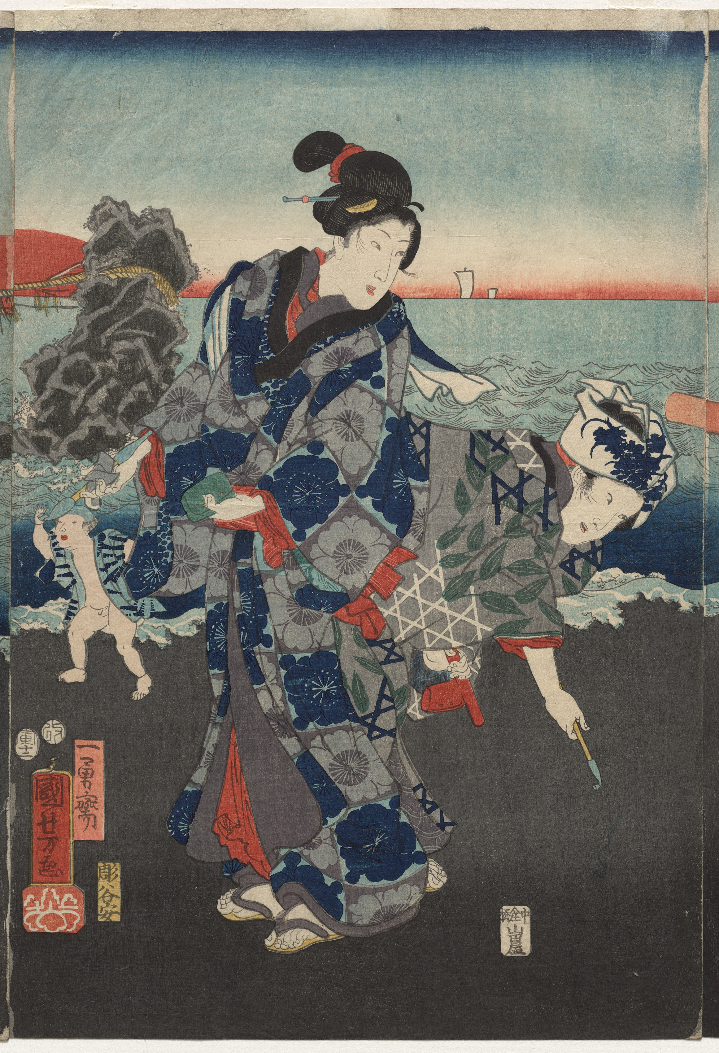Colorful woodblock print with two women in traditional Japanese kimonos on a beach. The woman on the left wears a kimono with a blue background and a large gray floral pattern. Her kimono has red accents and she wears a black obi. The woman on the right wears a kimono with a green leaf pattern and a red under kimono. The woman on the left has black hair with a red and gold pin and her hair tied up in a bun on top of her head. The woman on the right has a headdress on her head. The background shows a body of water with small waves and a small white dog. In the distance, there are mountains on the left and buildings on the right. The sky is blue and fades to red near the horizon. There are several Japanese characters written on the bottom left. The print has a worn and aged appearance with frayed edges.