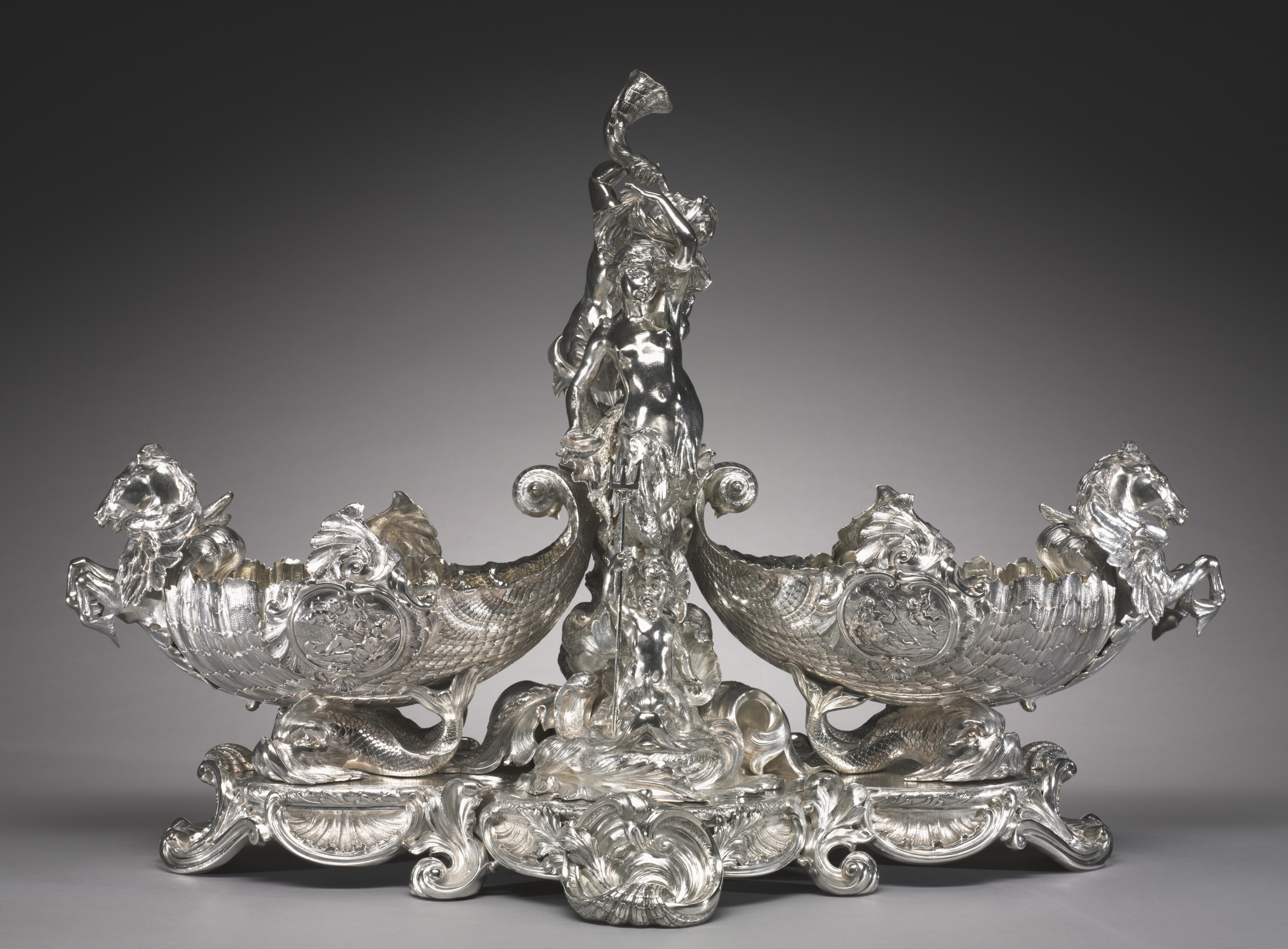 Silver centerpiece with two bowls on either side, supported by a central figurative design. The figurative design features a woman on top with flowing hair and a child, surrounded by two mermaids on the base. The base has a leaf-like design and scrollwork. Each bowl has a horse head on the front and a fish tail on the back. The bowls are decorated with a round relief. The background is dark gray to light gray.