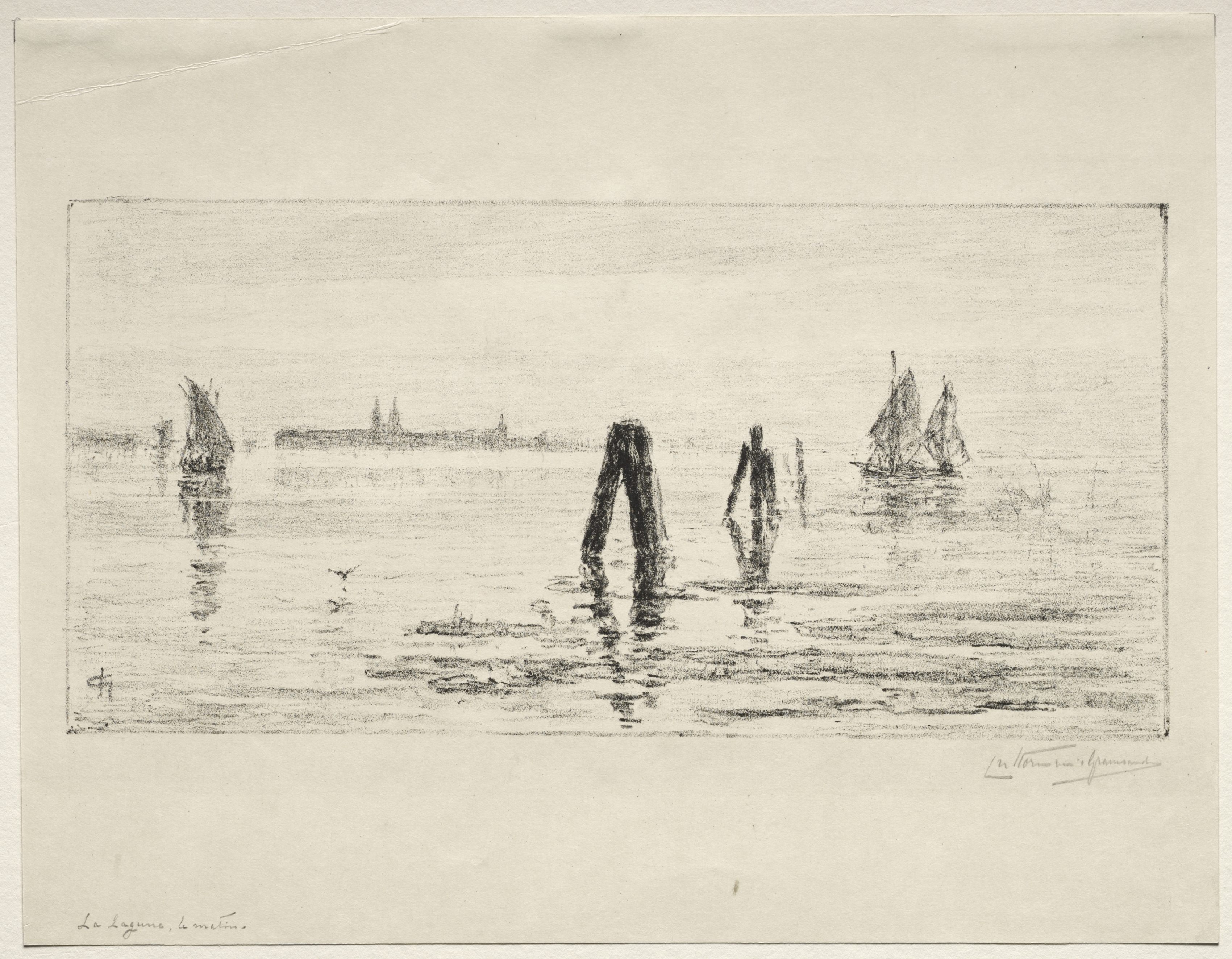 A landscape drawing of a lagoon on a calm day. The water dominates the scene, reflecting the surrounding elements. In the background, there are structures that appear to be buildings or part of a city skyline. Several boats are present on the water; one prominently on the right side with two sails up. There are also wooden poles or posts sticking out of the water. The image is rendered in shades of gray on a beige background, and there is a signature and title in the corners.