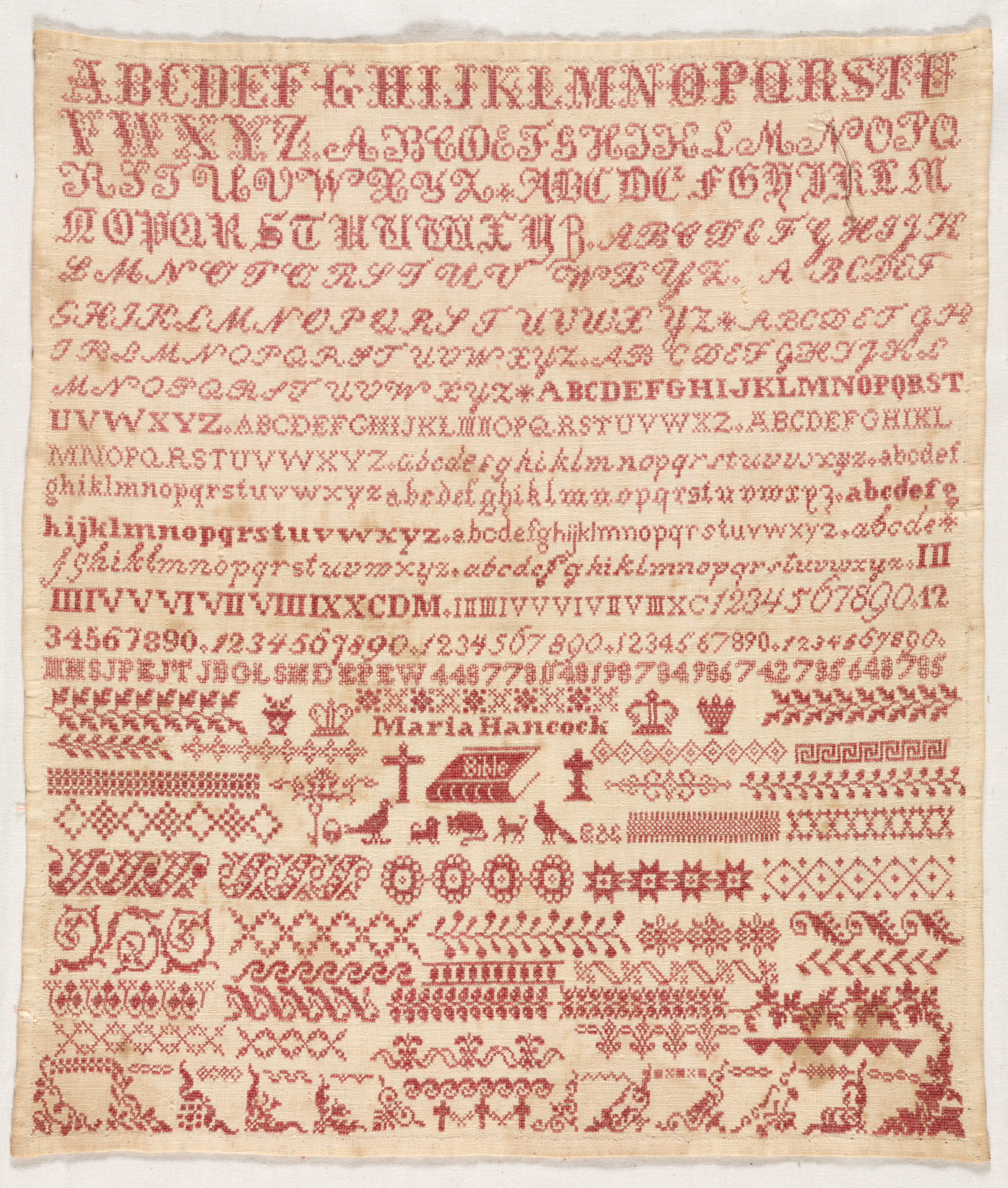 Red embroidered sampler on beige fabric. The sampler features multiple rows of alphabet letters in various fonts and sizes. Below the letters, there are several rows of numbers, including Roman numerals. A row of various symbols and motifs, including animals, a house, a cross, and a crown, is present. The bottom section features an ornate border with floral and geometric patterns. The artist's name, Maria Hancock, is embroidered on the sampler.