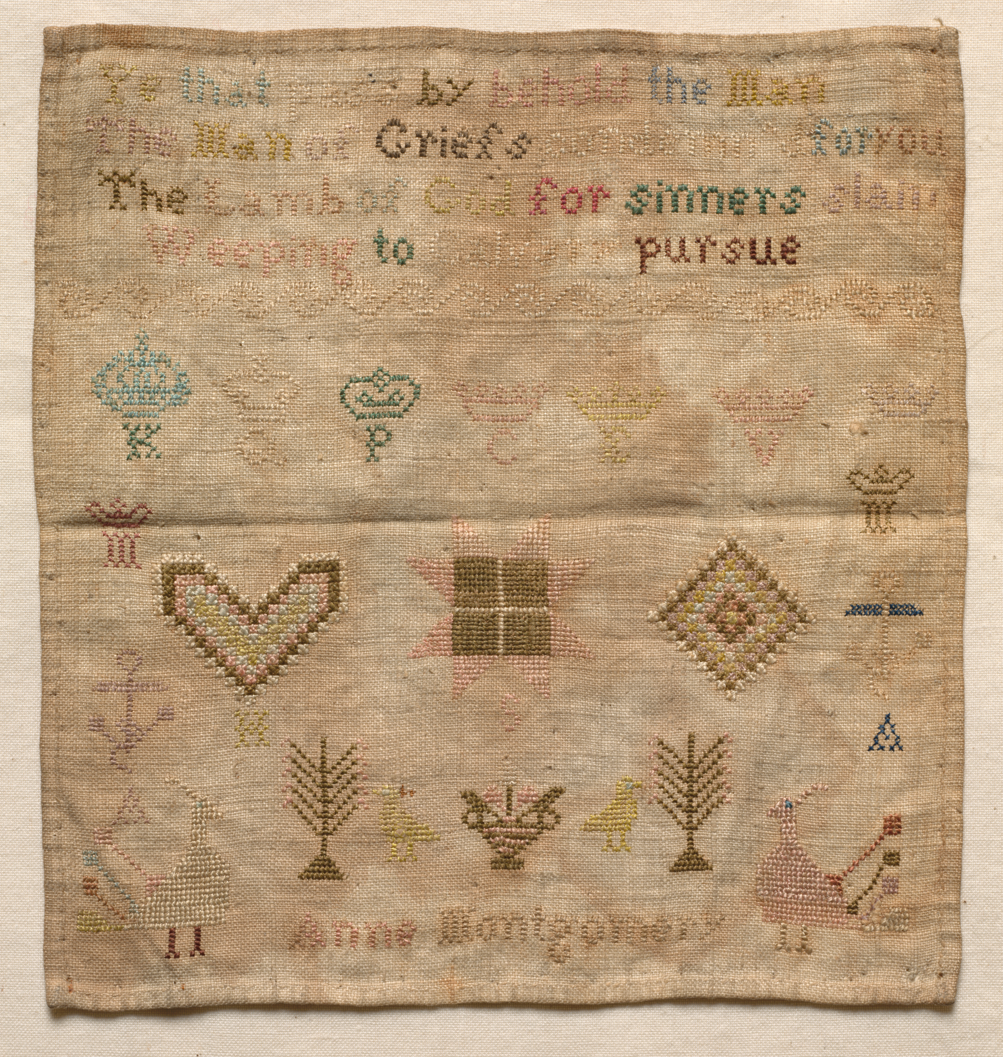 Tan-colored rectangular piece of fabric with a quote stitched in multicolored thread at the top and various shapes and designs below. The quote reads, "I find by Lying still the Man the Man of Griefs & Forlorn The Lamed Christ for sinners claim Sleeping to pursue". The designs include a heart, birds, trees, flowers, a bird with a long tail, and geometric shapes. The name "Anne Montgomery" is stitched at the bottom. Sampler by Anne Montgomery.