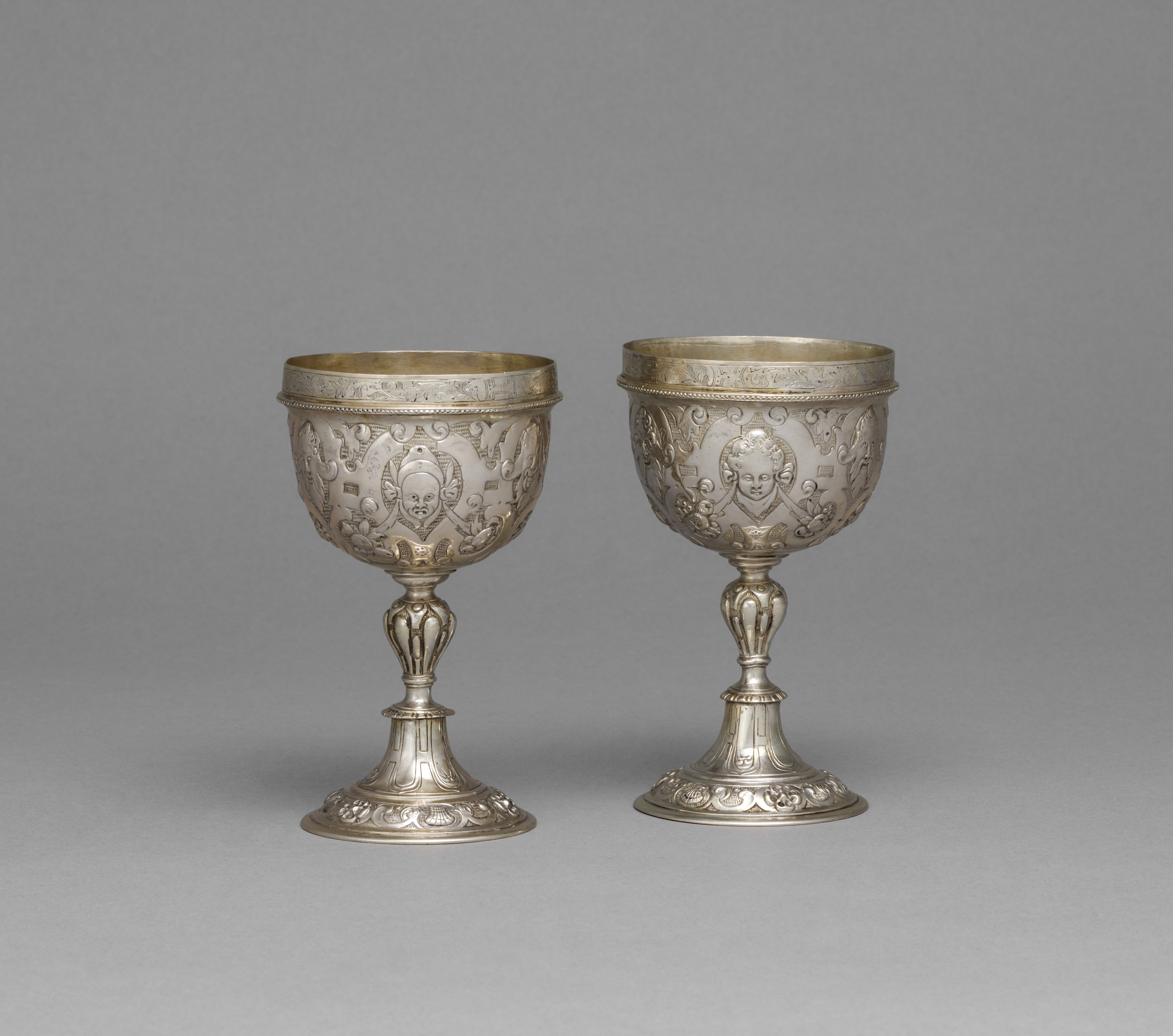 Two ornate, antique Bridal Cups by artist Israel Sluzker, made of silver, with intricate engravings and a gold rim. The cups have a wide, rounded bowl with a narrow stem and a flared base. The engravings feature various designs, including a face on the right cup. The cups are identical in shape but not in engraving. They are placed on a plain gray background.