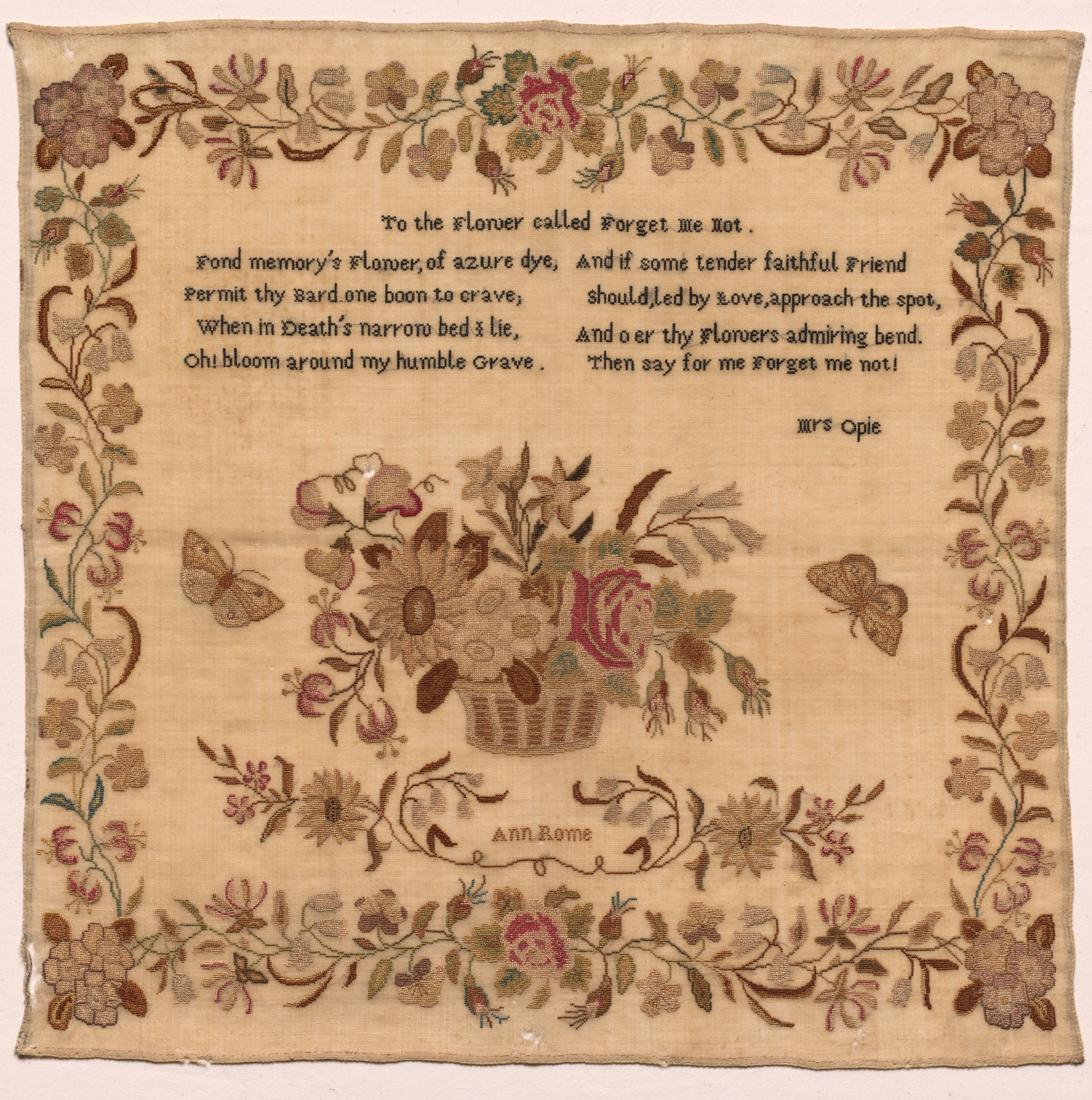 Sampler by Opie. Tan fabric with frayed edges. A poem in black text reads: "To the flower called Forget me Not. Fond memory's flower, of azure dye, And if some tender faithful friend Permit thy bard one boon to crave; should, led by love, approach the spot, when in Death's narrow bed I lie, And o'er thy flowers admiring bend. Oh! bloom around my humble Grave. Then say for me forget me not!" Signed in right corner: "xxxs Opie". Embroidered bouquet of flowers in shades of red, brown, green, and blue at bottom center. Two butterflies, one on left and one on right. Floral border around edges. Signed at bottom: "Ann Rome".