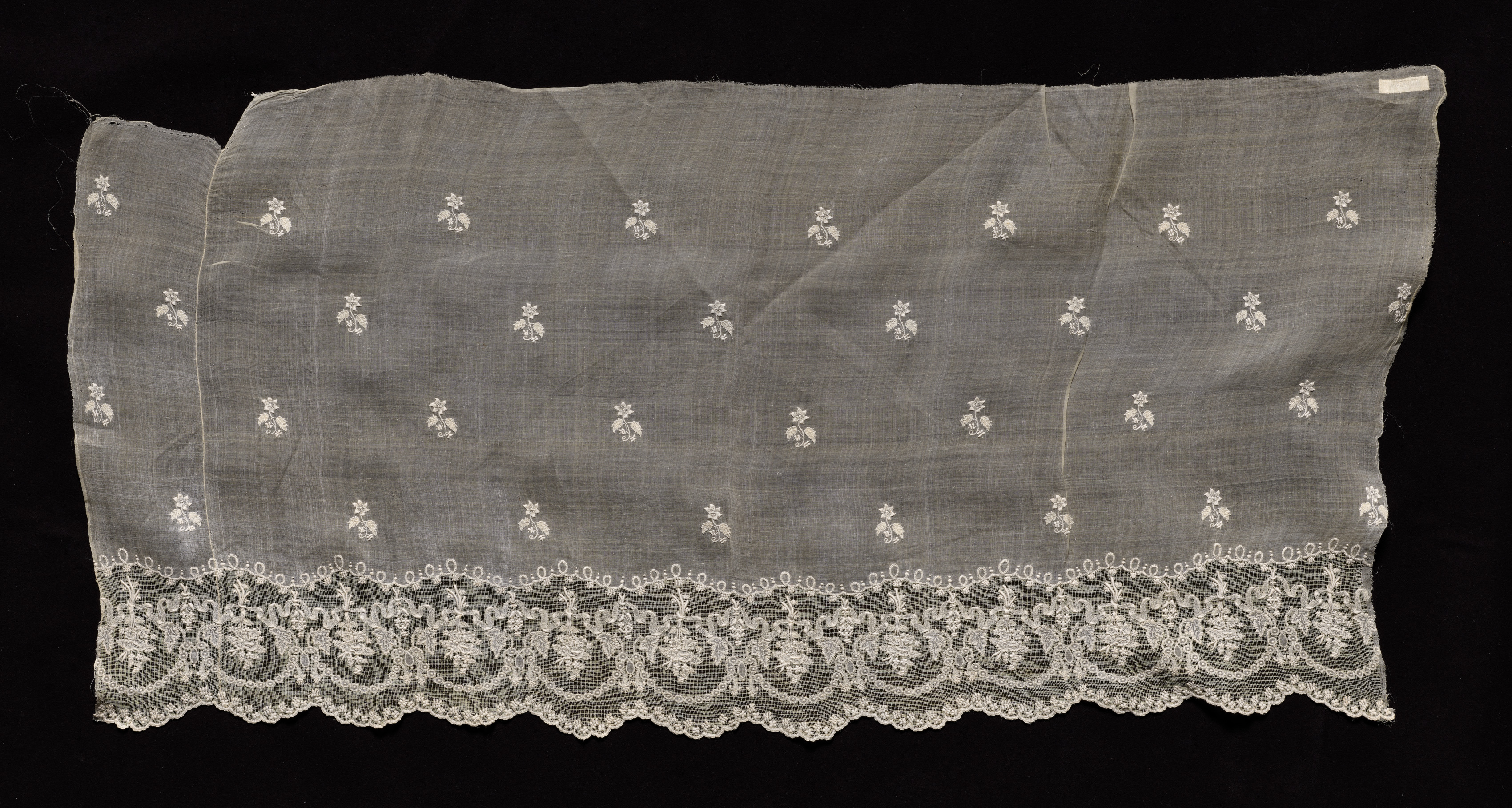 Gray sleevelike piece of fabric with white floral embroidery; bottom hem features intricate white floral lace trim.
