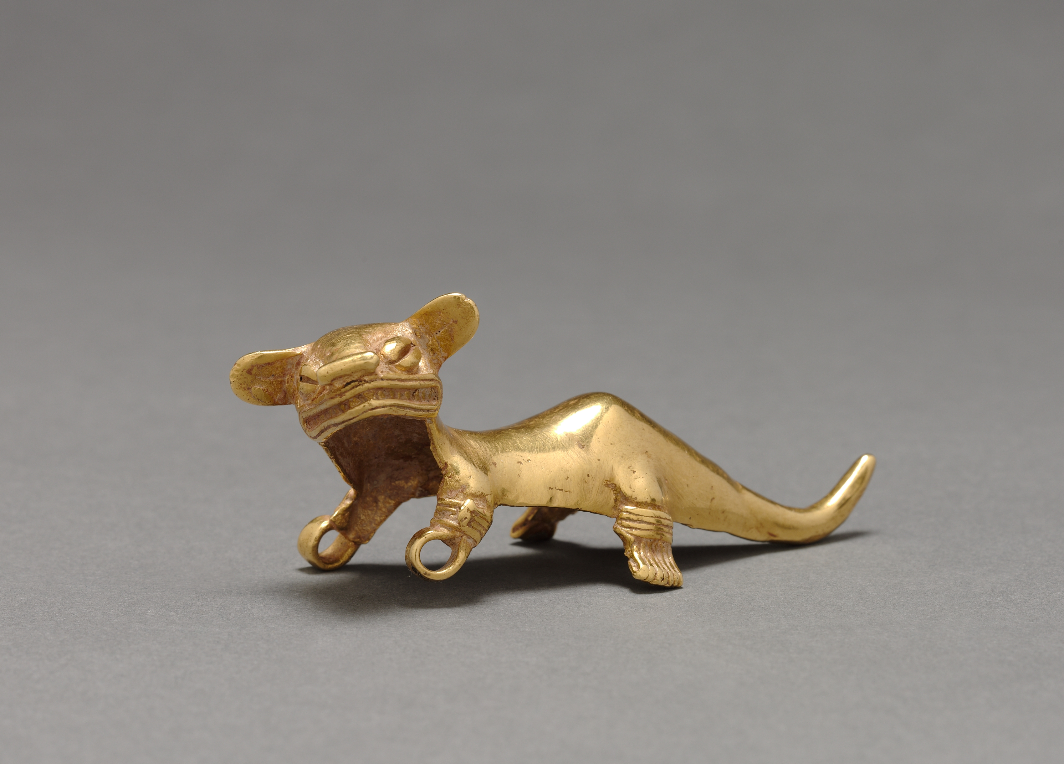 The Feline Pendant by the artist depicts a gold-colored metal figurine of a cat. The figurine is in a walking position, with its head facing left and its body angled to the left. It has a long tail extending behind it. The figurine is made of gold-colored metal and features a hollowed-out area under the head and chest. Two small rings are attached to the front legs. The cat has a smooth body with some engraved lines on the face, legs, and feet. The background of the image is a solid gray color.