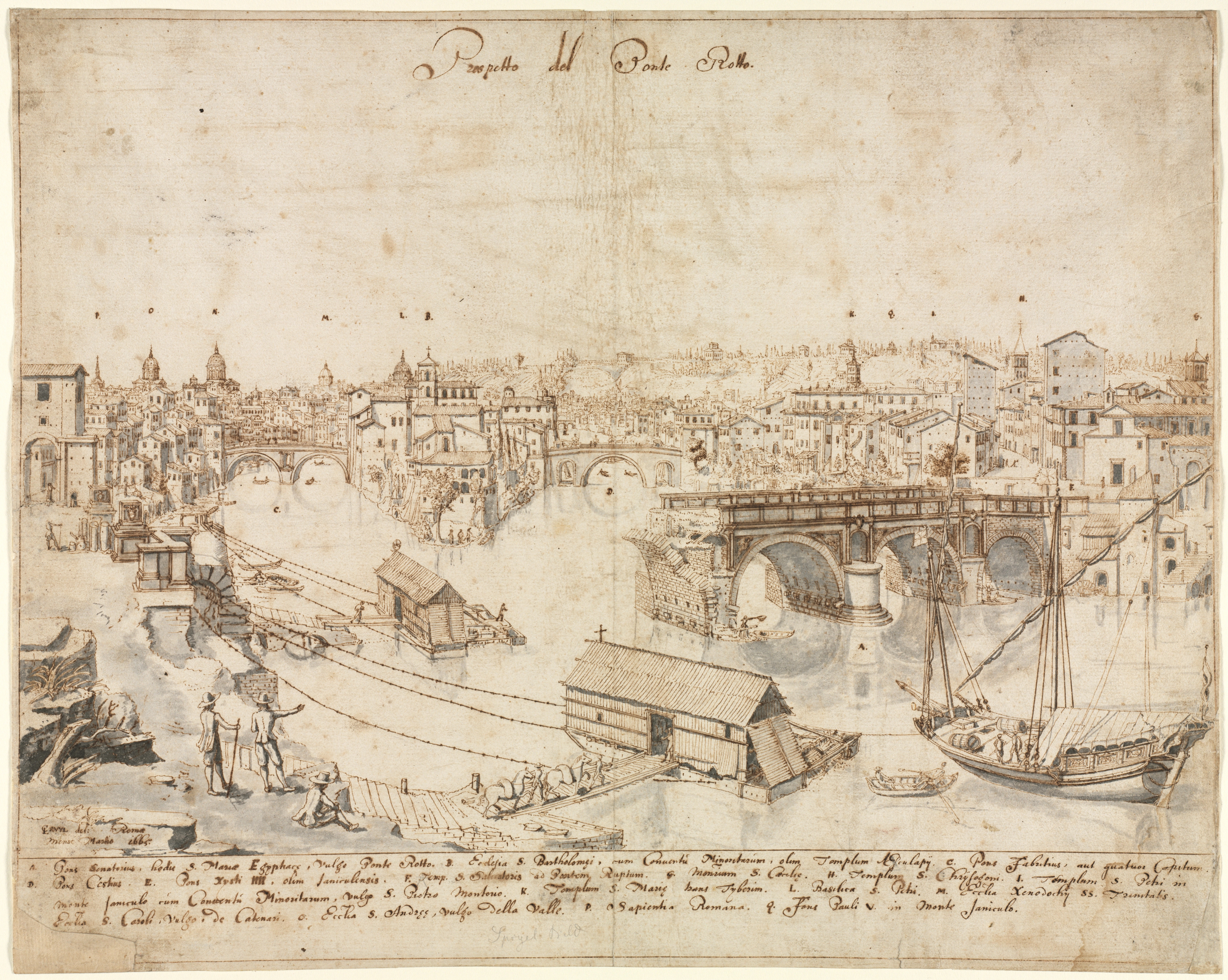 Sepia-toned drawing of a cityscape with a river and bridge. The bridge has three visible arches and is made of stone. A boat with a single mast and ropes is on the right side of the river. There are buildings on both sides of the river. A water wheel is on the left side. People are standing on the riverbank. A title is written in cursive at the top center. A key or description is written in a foreign language at the bottom.