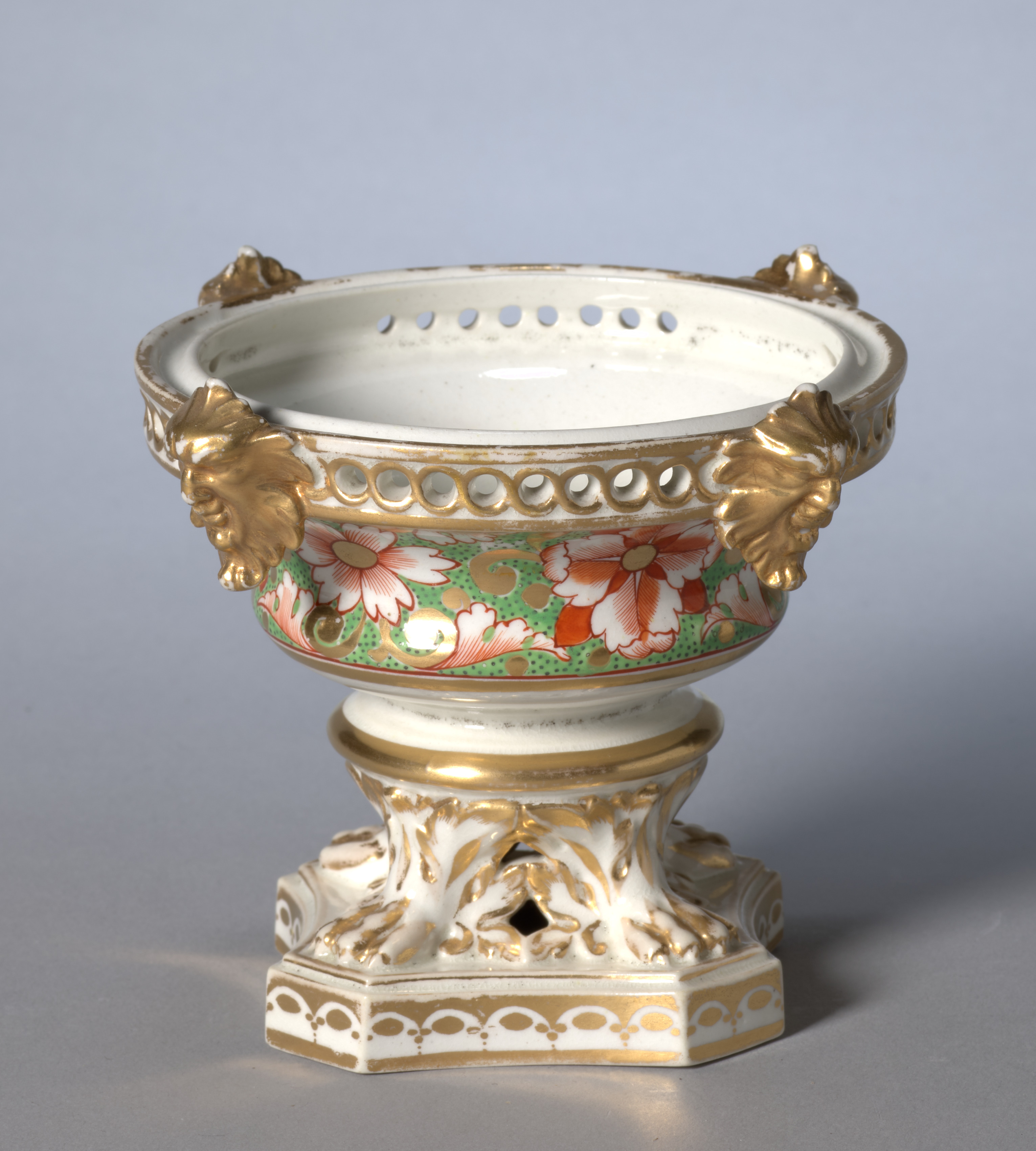 White vase with gold accents and floral design, titled "Potpourri Vase" by Derby. The vase has a wide mouth and a narrow base. The base is octagonal and features a gold and white design. The body of the vase is white with a green band of pink and white flowers around the middle. Above and below the floral band are gold bands with circular indentations. There are four gold leaf-like handles around the rim. The interior of the vase is white and features small holes around the rim. The background of the image is gray.