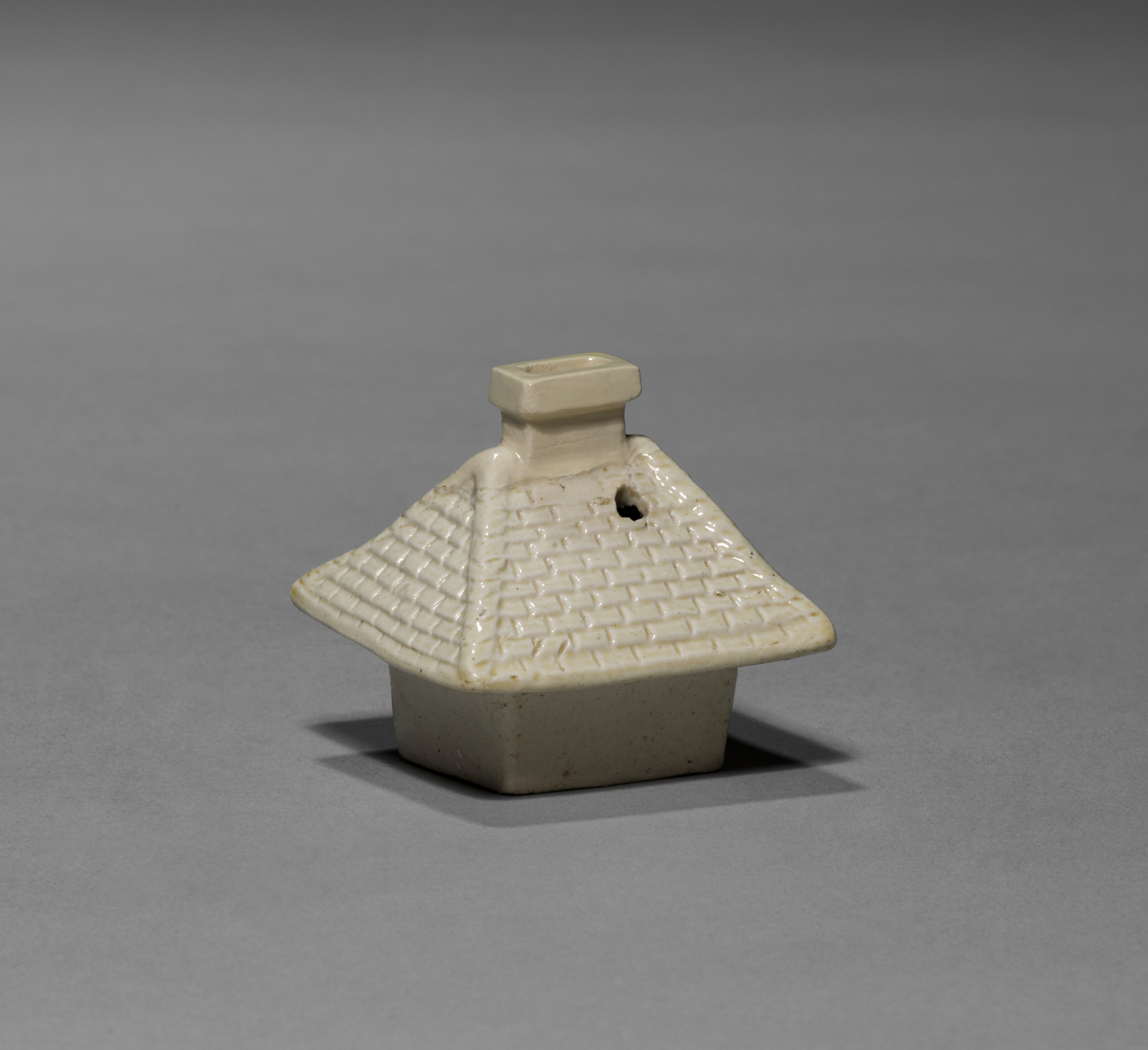 Teapot lid by Staffordshire Factory. Small, off-white ceramic teapot lid. The lid is shaped like a house roof with a short chimney on top. The roof is triangular with a textured, grid pattern resembling roof tiles. There is a small hole at the front of the roof. The base of the lid is square. The lid has a shiny glaze. The background is grey.