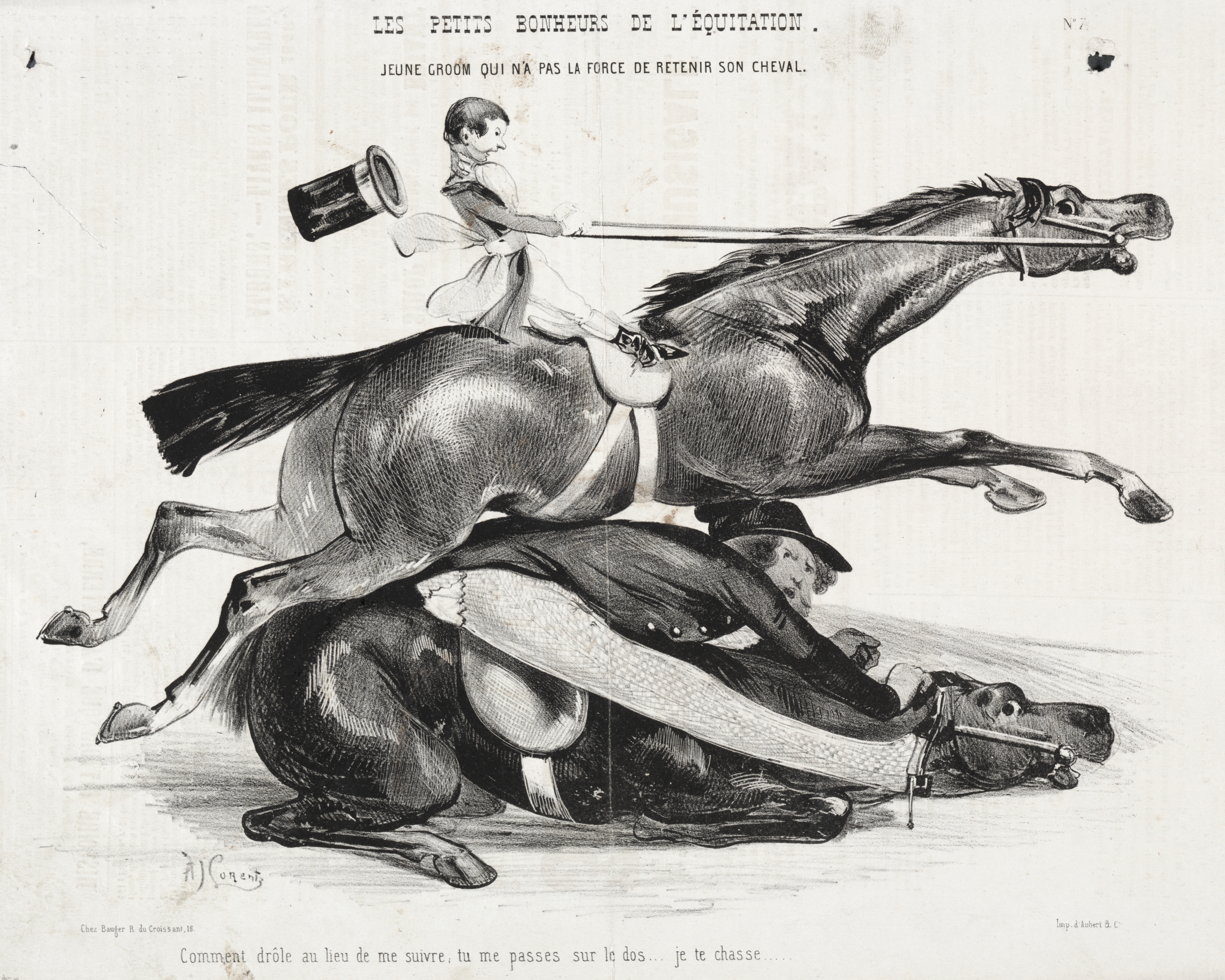 The image depicts a black and white drawing of a horse and two people. The horse is dark brown with a darker mane and tail, and it is rearing up on its hind legs. A young boy sits on the horse's back, holding a long whip in his right hand and a top hat in his left. He wears a white shirt, pants, and a jacket. Underneath the horse is a man lying on the ground, wearing a dark jacket and pants, and a hat. The man is looking up at the horse. At the top of the image, there is text that reads "LES PETITS BONHEURS DE L'ÉQUITATION" and "JEUNE GROOM QUI N'A PAS LA FORCE DE RETENIR SON CHEVAL". There is additional text at the bottom of the image. The background of the image is off-white.