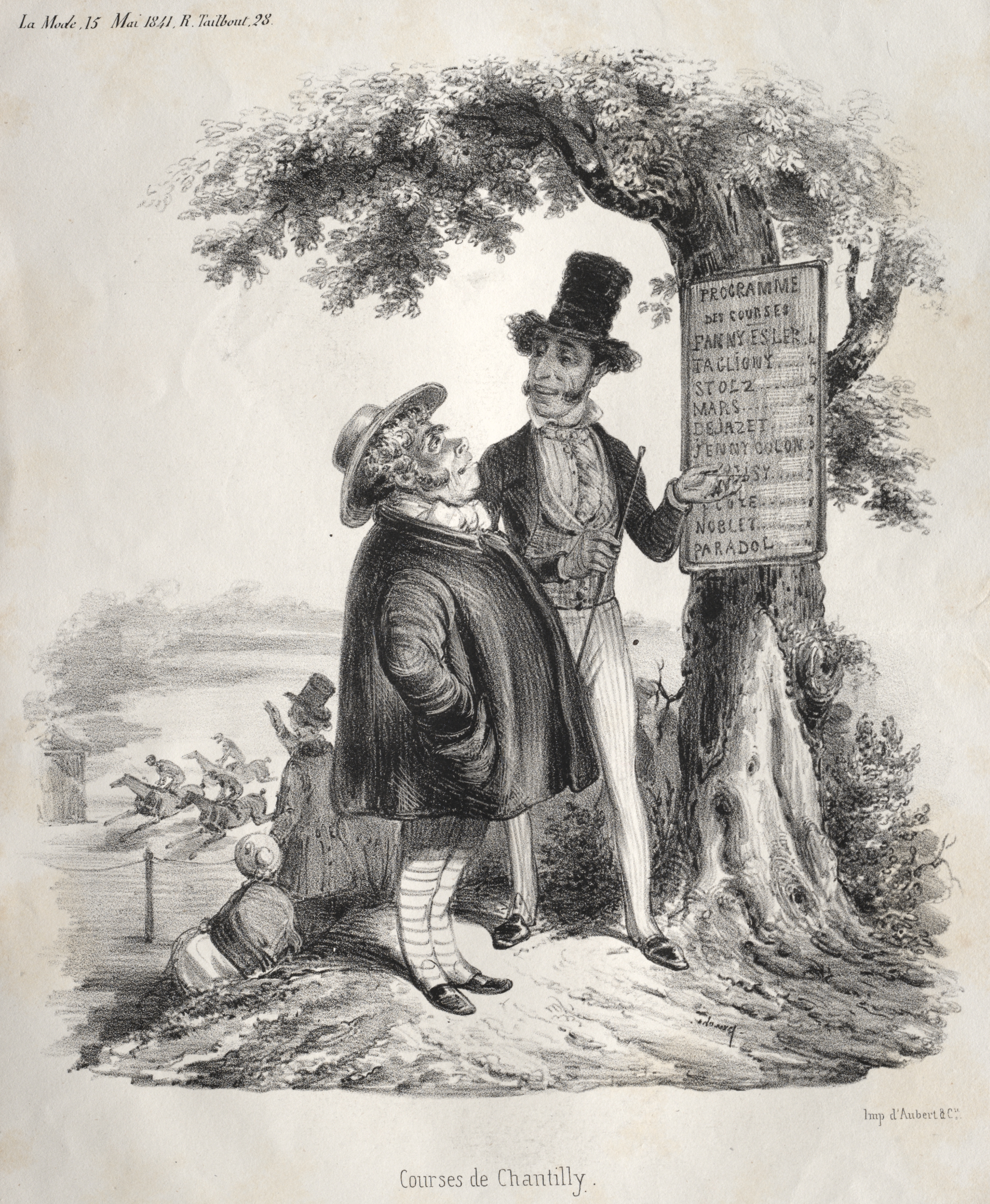 Black and white drawing of two men in old-fashioned clothes standing next to a tree with a sign. The man on the left wears a cap, a long coat and holds a cane. The man on the right wears a top hat and vest. A horse race takes place in the background. The image is titled "Courses de Chantilly" and is by artist Clémente Pruche.