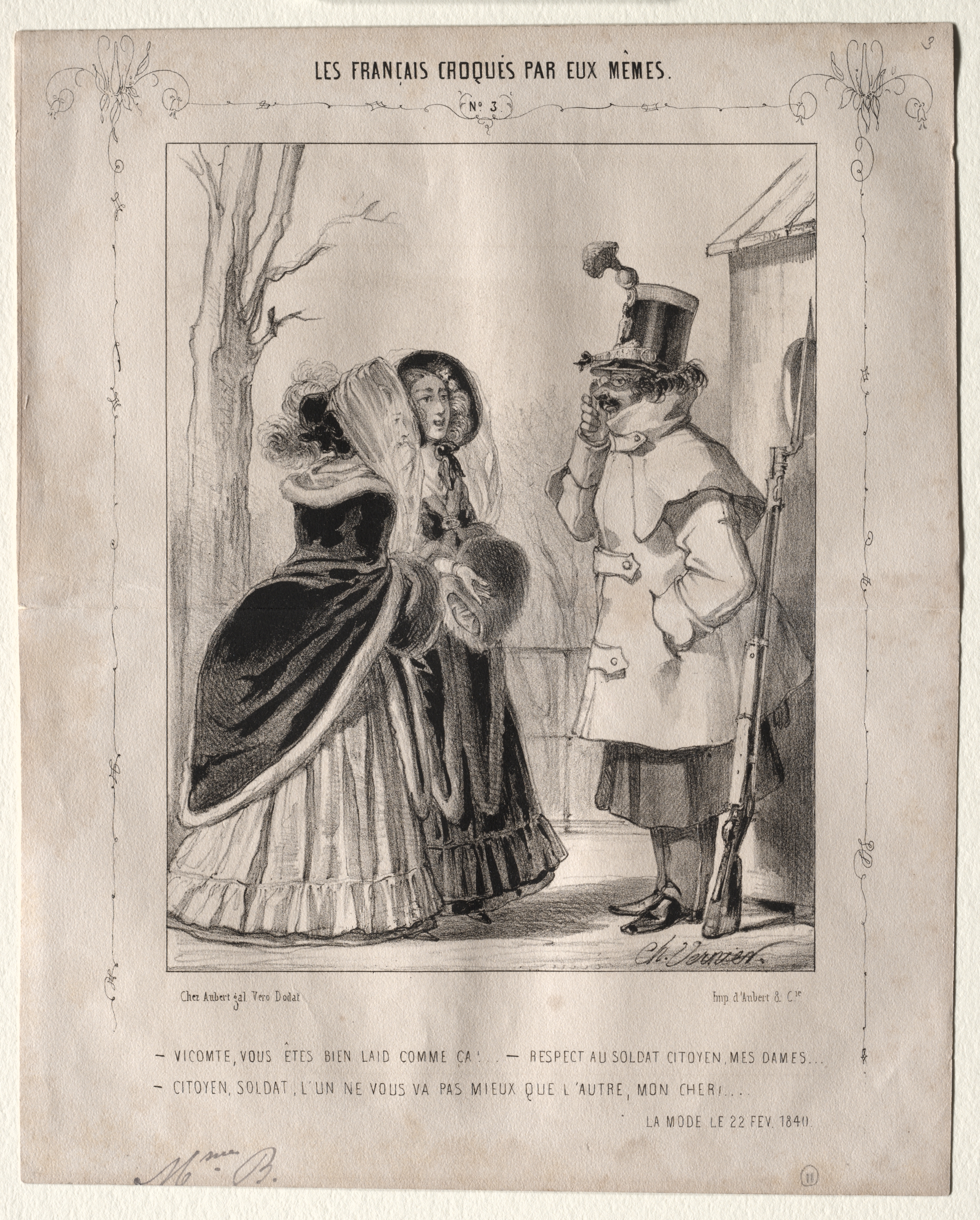 Les Français croquès par eux-mêmes: Vicomte, vous êtes bien laid comme ca!,,,Respect au soldat citoyen, mes dames...Citoyen, soldat, l'un ne vous va pas mieux que l'autre, mon cher!