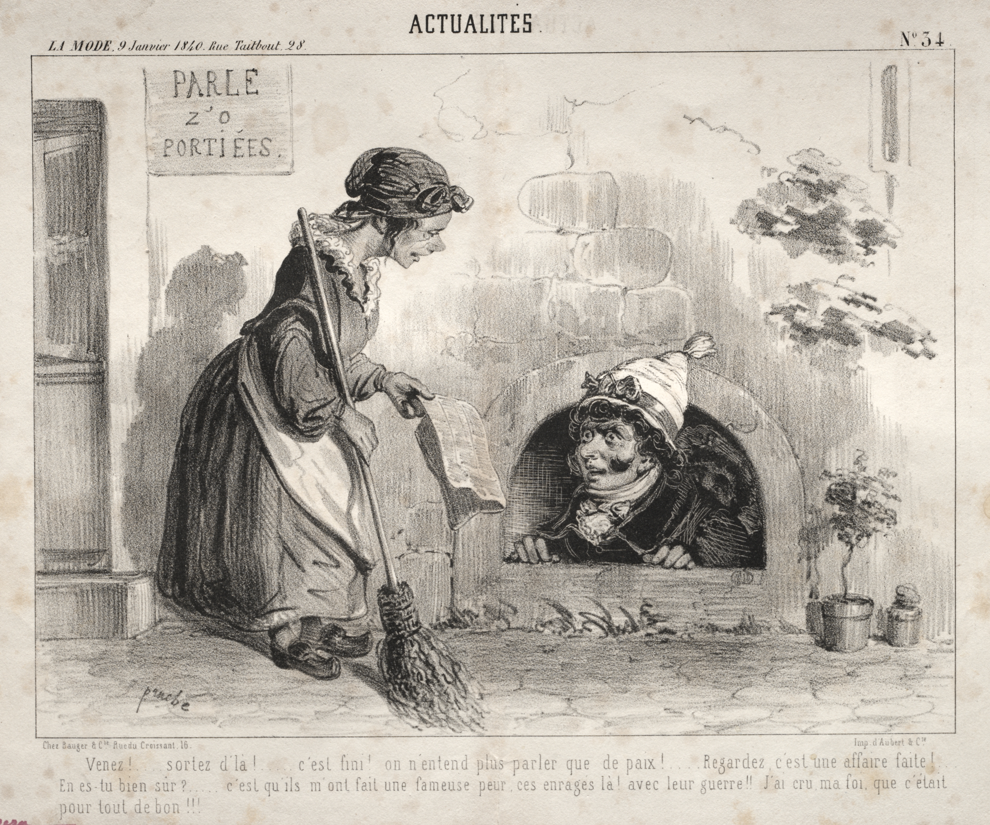 Black and white drawing of a woman in period clothing sweeping a stone ground with a broom; she faces right and peers down at a man whose head and arms are visible through a stone archway; a plant sits to the right of the archway; in the background is a sign reading PARLEZ O PORTIEES; text in a foreign language is present at the bottom and top of the image; the top also features the word Actualités.