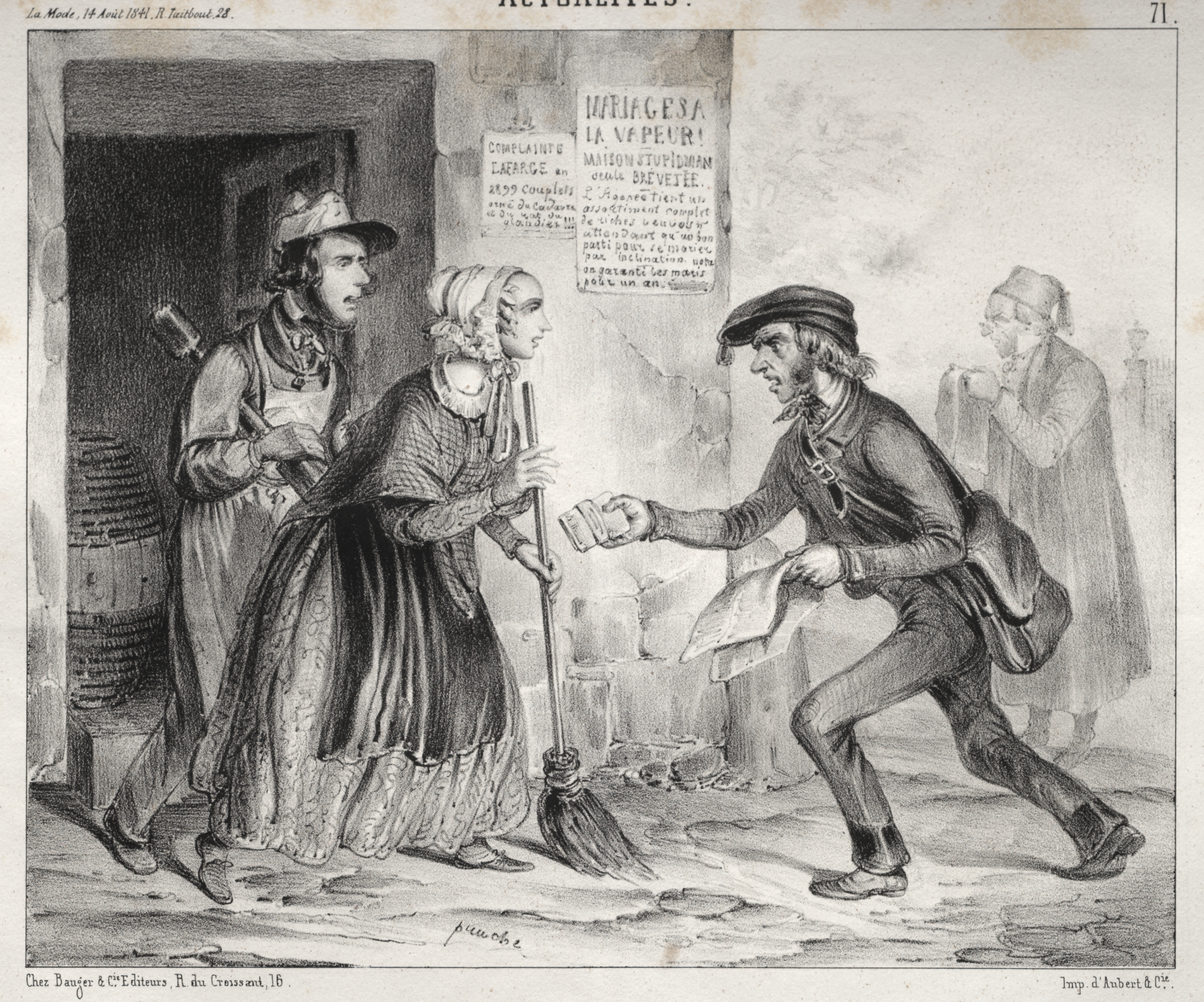 Black and white drawing of four people in 19th-century clothing. Man on right lunging forward in a running position, holding a piece of paper in his outstretched right hand. He wears a hat, long sleeve shirt, pants and shoes. Man on left wears hat, apron over long sleeve shirt and pants. Woman in middle wears long dress and head covering holds broom. Man in background on right wears long coat. A doorway on left, and a wall with writing on it behind people.