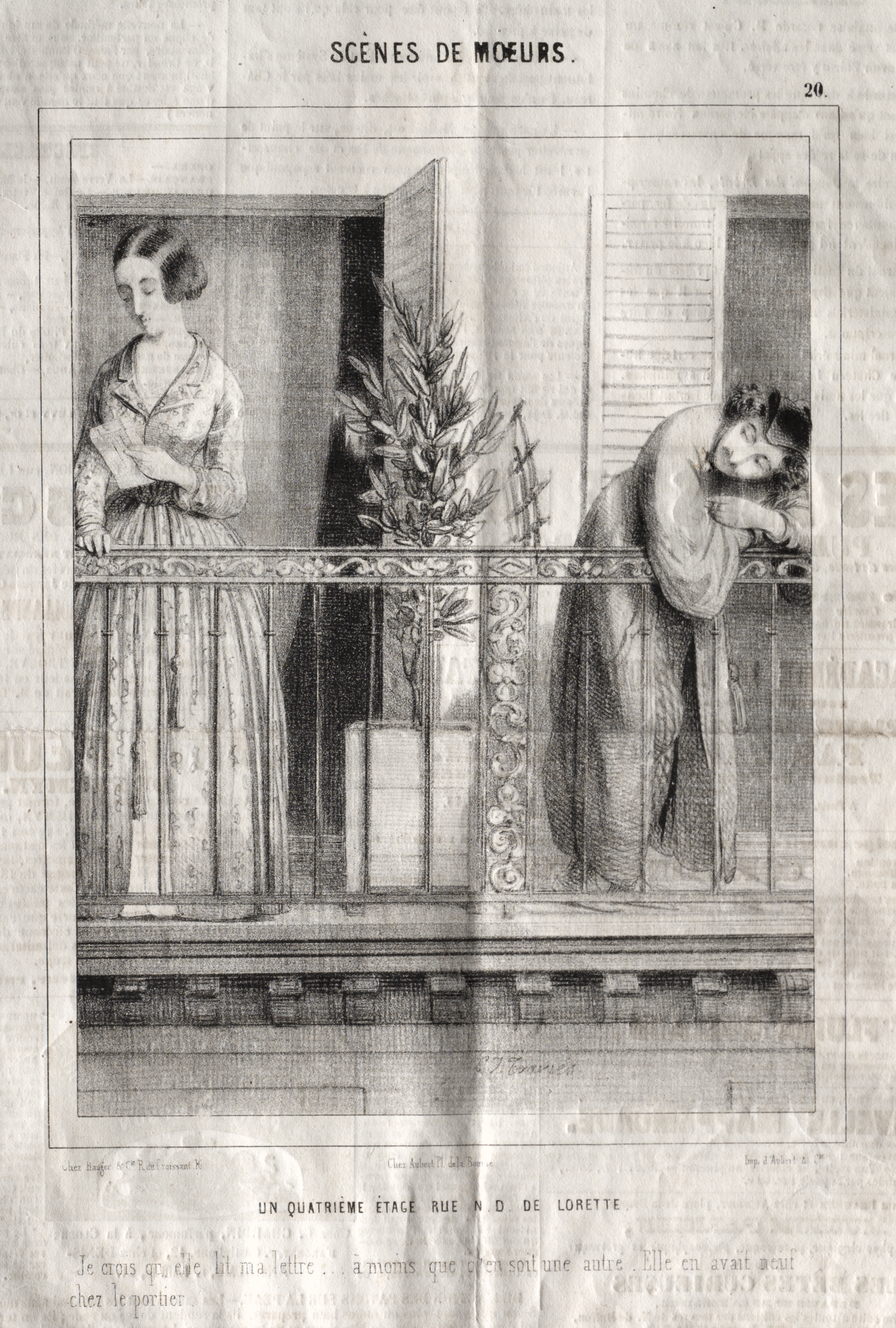 Black and white drawing of a scene on a balcony. Two women, both wearing dresses and with their hair pulled back, are standing on a balcony with a railing. The woman on the left has her arms crossed and looks down to her right. She is standing next to an open doorway. The woman on the right looks down over the railing with her elbows resting on the railing. A plant sits between them. The balcony appears to be on the fourth floor of a building. The background shows a wall with a window on the right. Text above the image reads "Scenes de Moeurs" and below the image reads "Un quatrieme etage rue N. D. de Lorette."