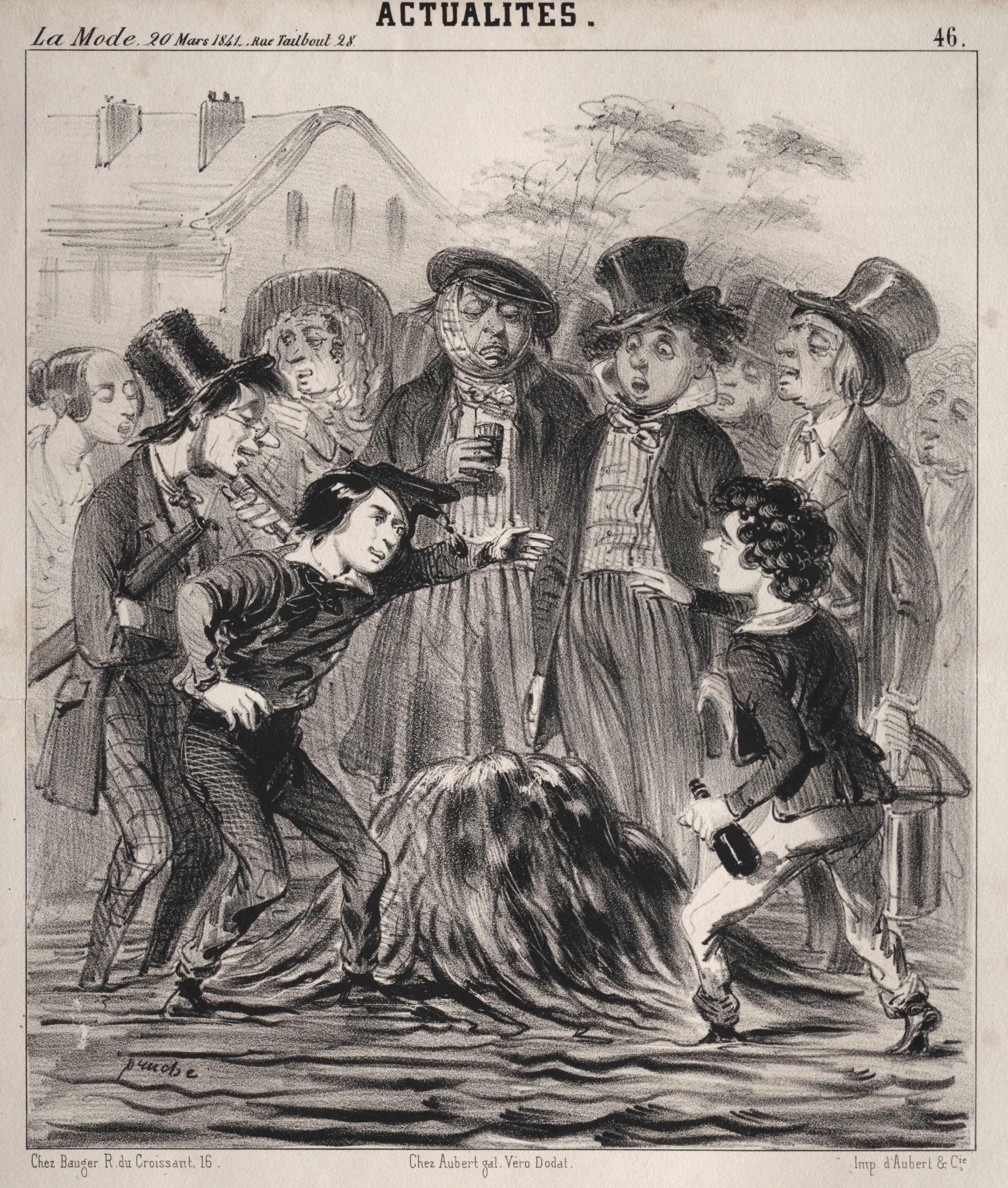 Black and white drawing of a chaotic scene. A woman's skirt is blown up by the wind. Men in top hats look on. A young girl holds down the woman's skirt. A house and people are in the background. The drawing is bordered by a thin line. Text is at the top and bottom.
