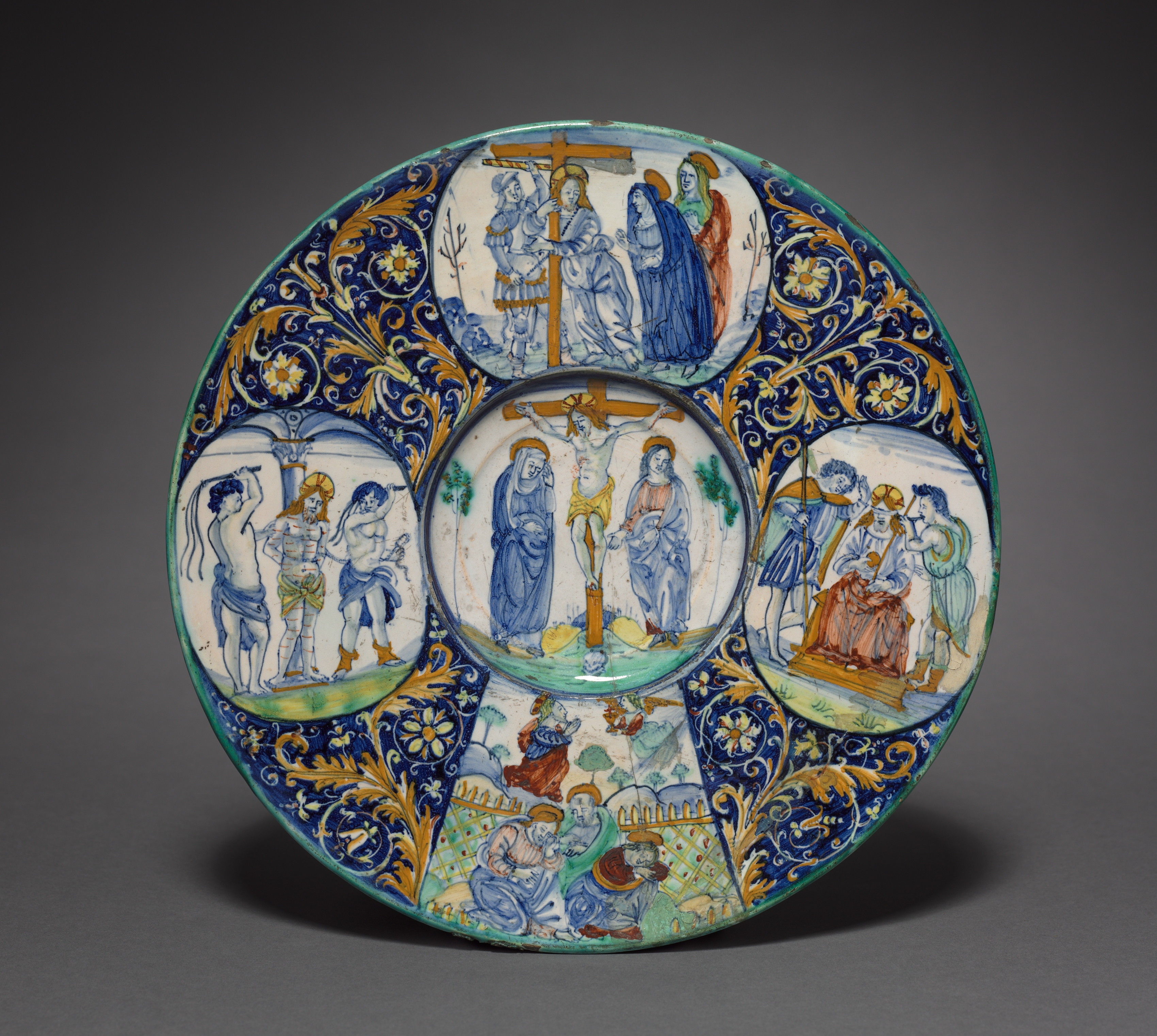 The plate is round with a wide rim. The rim has a blue background with gold and white floral designs. There are five oval scenes on the plate. The center scene shows Jesus on the cross with two people on either side. The scene at the top depicts a group of four people around a cross. The scene on the right shows a man sitting and talking to another person. The scene on the left shows three men, one with a cloth wrapped around his waist. The scene on the bottom shows a group of people. The plate has a dark gray background.