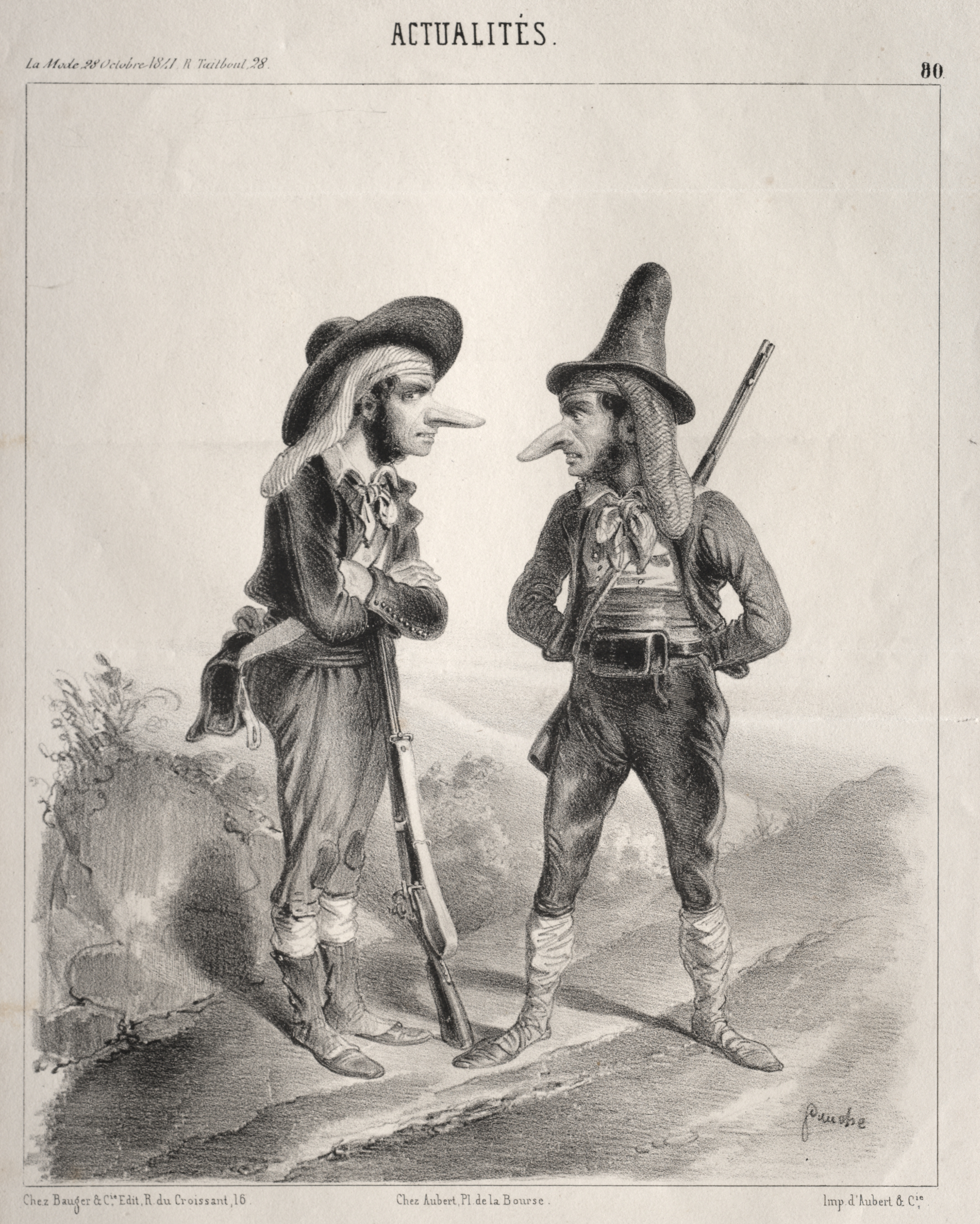 Black and white illustration of two men with exaggeratedly long noses. The man on the left wears a large hat and holds a rifle, with one leg bent and resting on a rock or ledge. The man on the right wears a tall hat, holds a rifle over his shoulder, and has his hands on his hips. Both men wear 19th-century military-style clothing, including jackets, pants, and boots. The background shows a landscape with hills and vegetation. The image has a caption at the top and small text at the bottom.