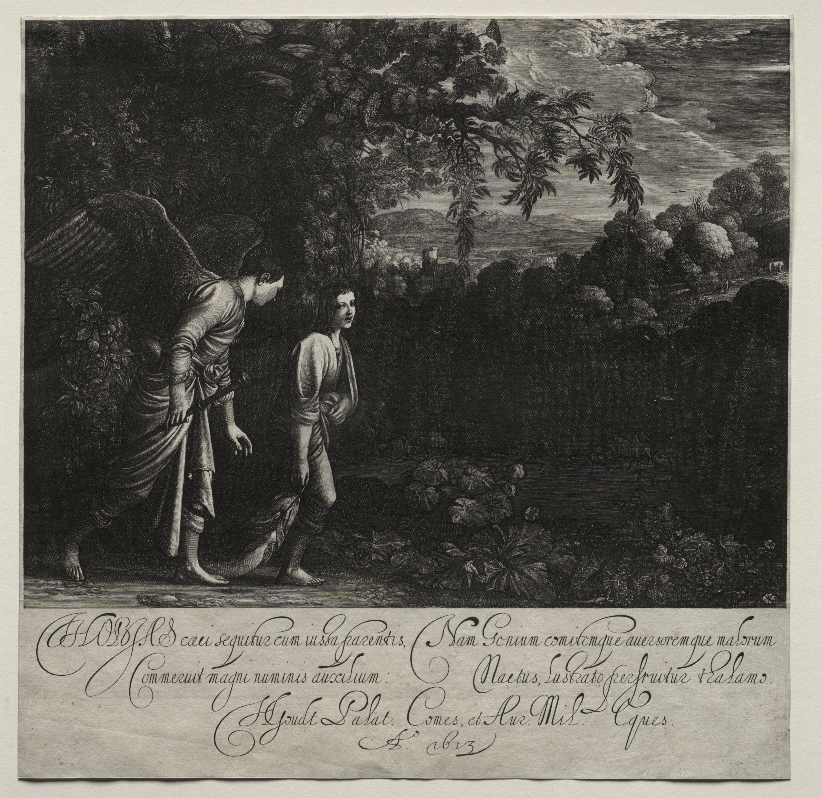 Black and white image of two men in a wooded area. The man on the left appears to be an angel with feathered wings. He wears a long cloth garment gathered at the waist with a belt. He appears to be barefoot and holds a staff. The man on the right is dressed in simple clothing that exposes his shins. The men face each other. The angel holds a large fish by its tail. The wooded area features trees with dense foliage on both sides of the two men. A body of water and cloudy sky are visible in the background. A strip of cursive writing appears along the bottom.