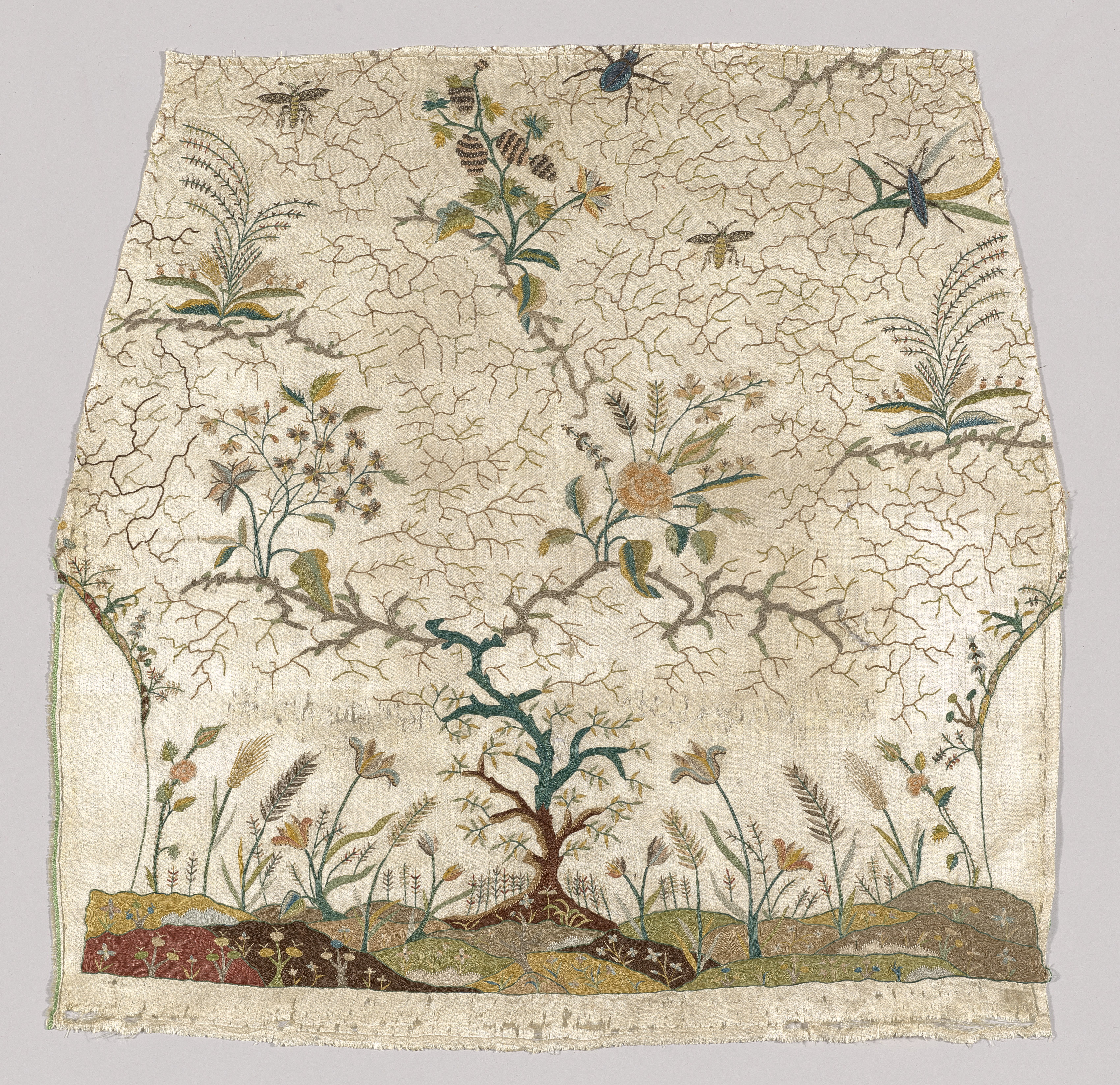 Fragment of a Garment by an unknown artist depicts a rectangular piece of fabric with a frayed edge, featuring a tree with a brown trunk and green and brown branches. The fabric showcases a landscape with a tree and various plants and insects in shades of green, brown, yellow, and blue on a cream-colored background. The bottom of the fabric displays a grassy hill with flowers and a tree. Several insects, including beetles and dragonflies, are scattered throughout the design. The overall scene is intricately detailed, suggesting a high level of craftsmanship.
