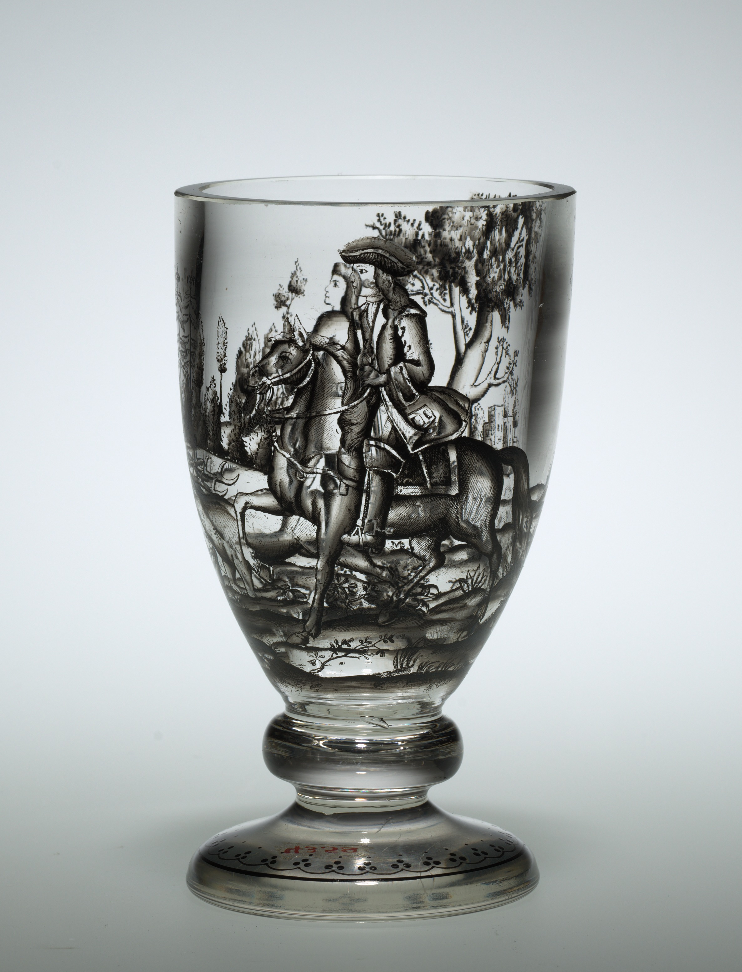 Clear glass goblet with wide mouth and narrow base. The goblet features a black and white engraving depicting a man on horseback wearing 18th-century attire, including a tricorn hat, long coat, and boots. The man holds a sword in his right hand and the reins in his left. The horse is rearing up on its hind legs. The engraving also includes trees and foliage in the background. The goblet's base has an engraved design around the bottom. The title of the piece is "Glass" and the artist is not specified.
