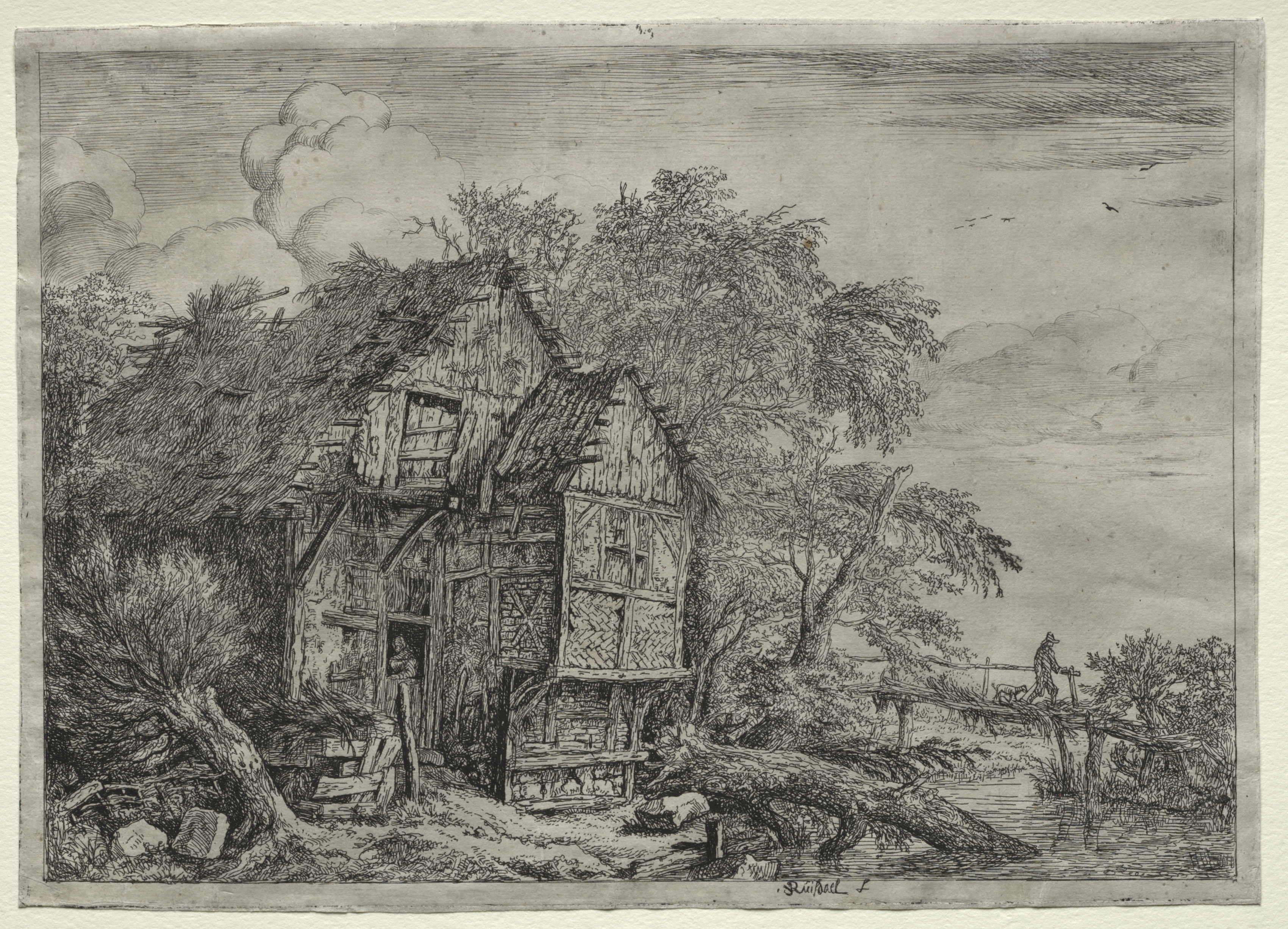 The Little Bridge by Jacob van Ruisdael: A black and white etching of a rural scene. A two-story half-timbered house with a steeply pitched roof and multiple windows stands on the left. The house appears old and weathered. A dirt path leads to the house's doorway. Trees and bushes surround the house. A small wooden bridge spans a stream or river on the right. A figure stands on the bridge. The sky is cloudy with some birds flying overhead.