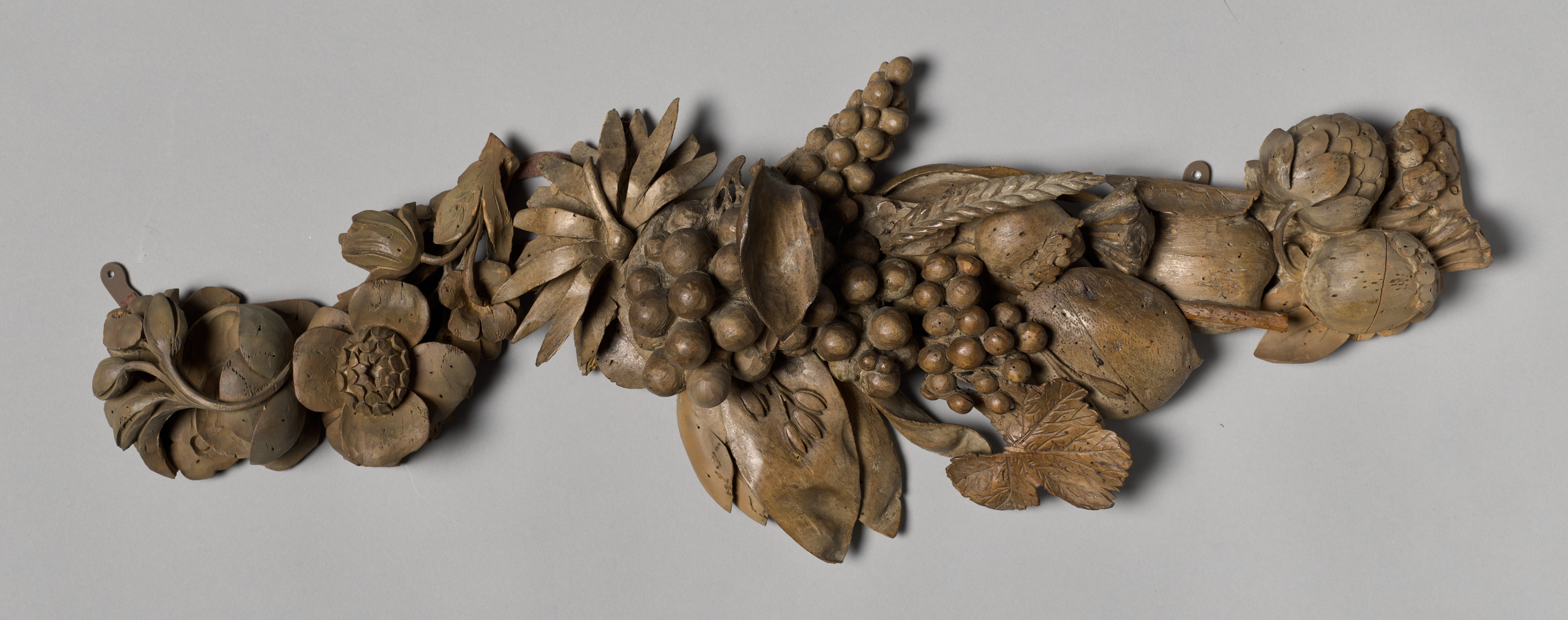 Brown carved wooden overmantel with flowers, fruits, and leaves. The carving includes several types of fruits such as grapes, pears, and pomegranates. There are also several types of flowers and leaves. The carving is asymmetrical, with elements extending to the left and right. The background of the image is gray.