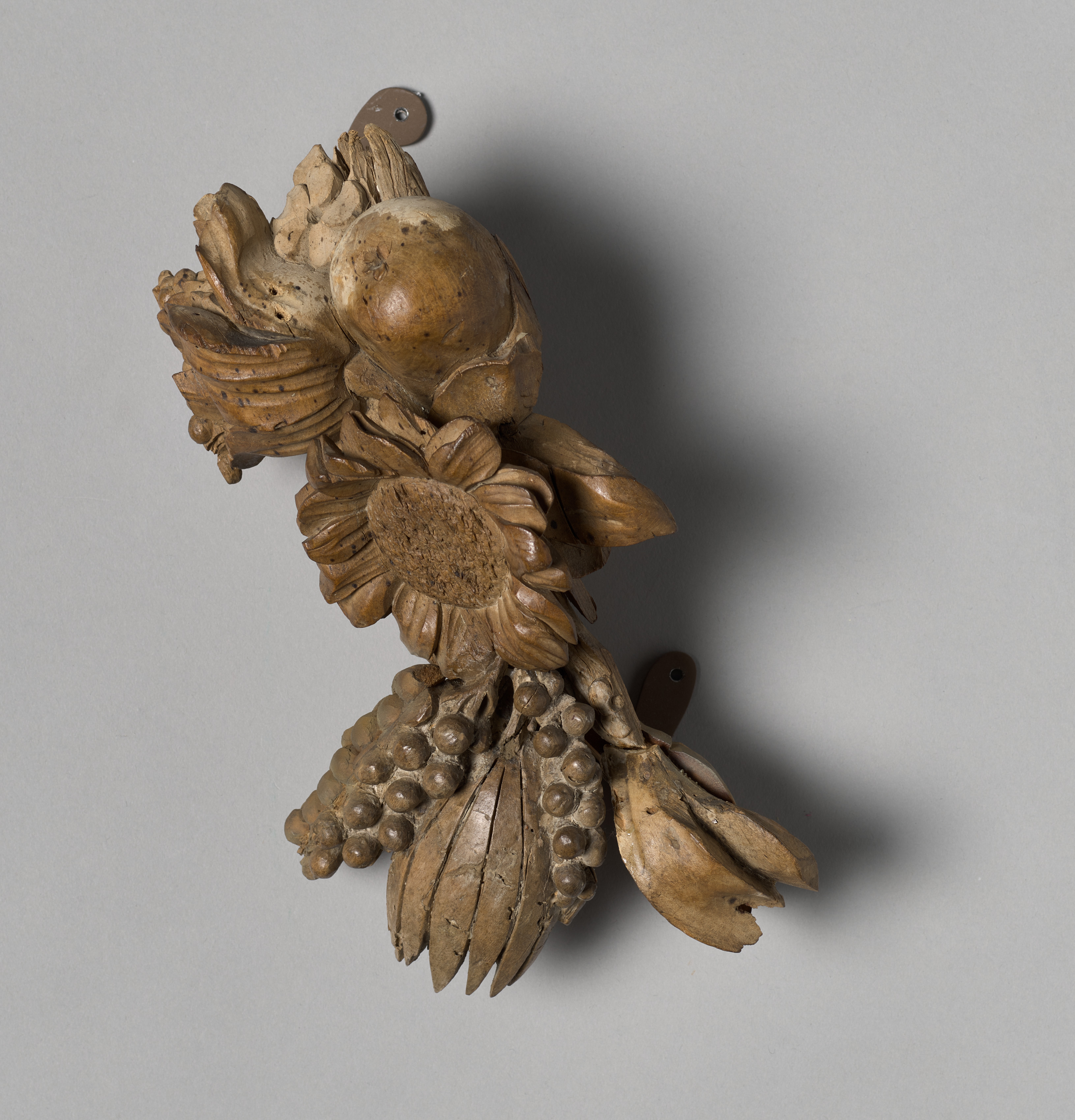 Brown carved wooden ornament with a sun at the top, carved with rays extending outwards; bottom carved to look like a bunch of grapes; two metal brackets on back.
