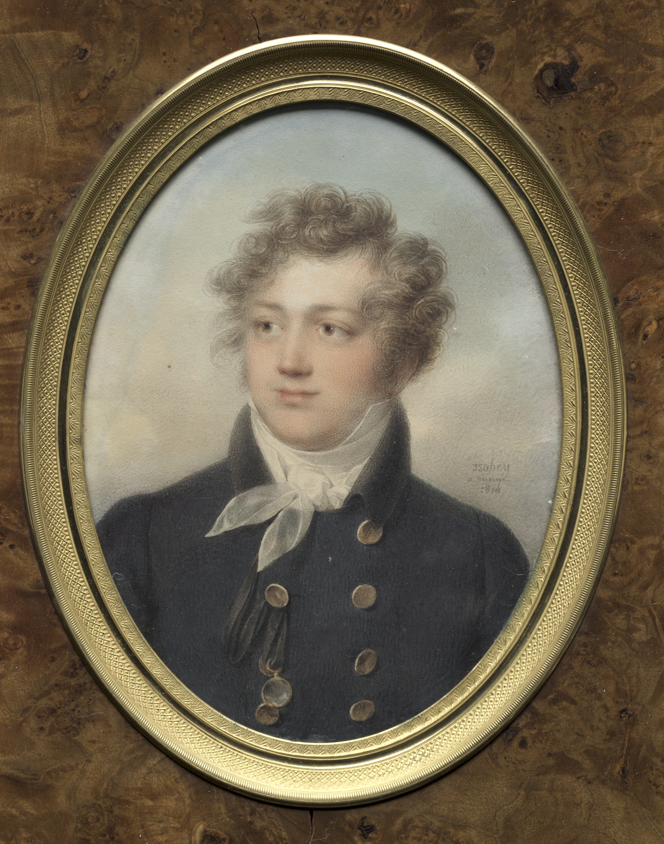 Oval-shaped portrait of a man with fair skin and curly, light brown hair. He wears a dark blue jacket with six buttons down the front and a high white collar. A white neck scarf tied in a knot is visible under the collar. The background of the portrait is a light blue and white color. The portrait is framed in gold with a patterned border and is set against a brown wooden background with a burl texture. The portrait is signed in the lower right corner.