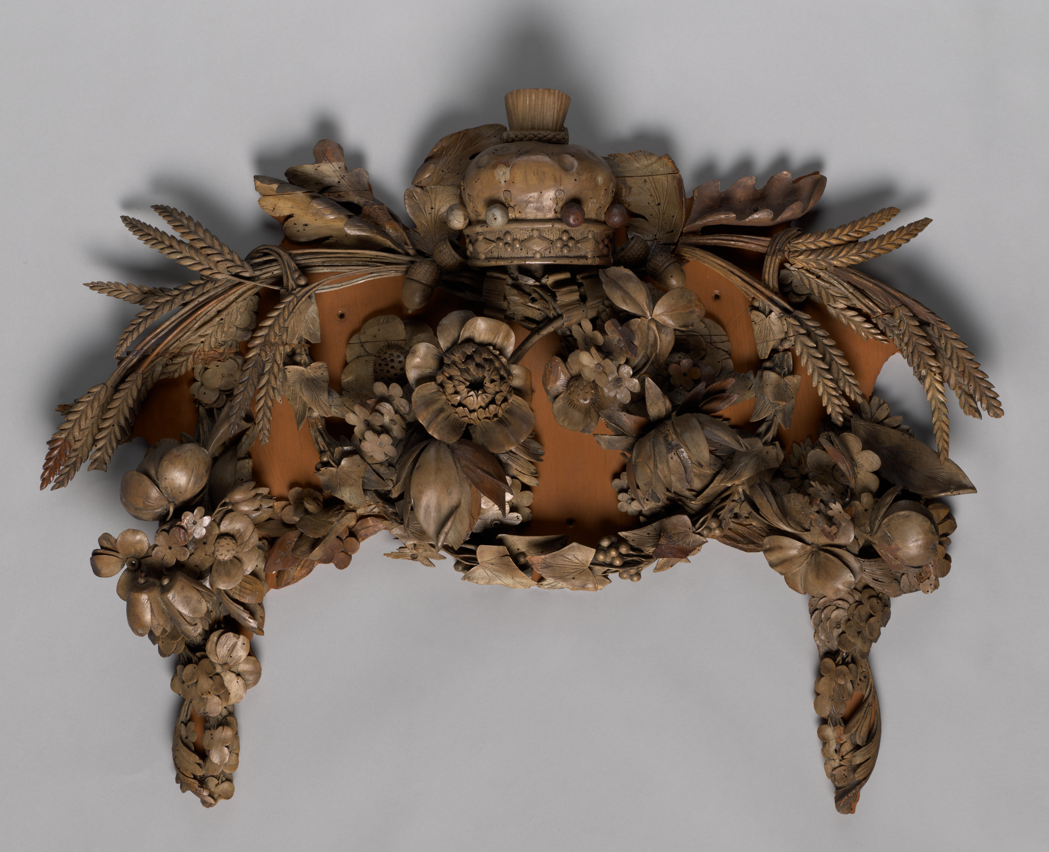 Overdoor Decoration by Grinling Gibbons. Wooden overdoor decoration featuring a crown at the top, adorned with intricate carvings of leaves, flowers, fruits, and grains. The decoration has a curved top and two downward-pointing ends. The background of the decoration is orange-brown. Small carved flowers adorn the left and right sides. The decoration is set against a light grey background.