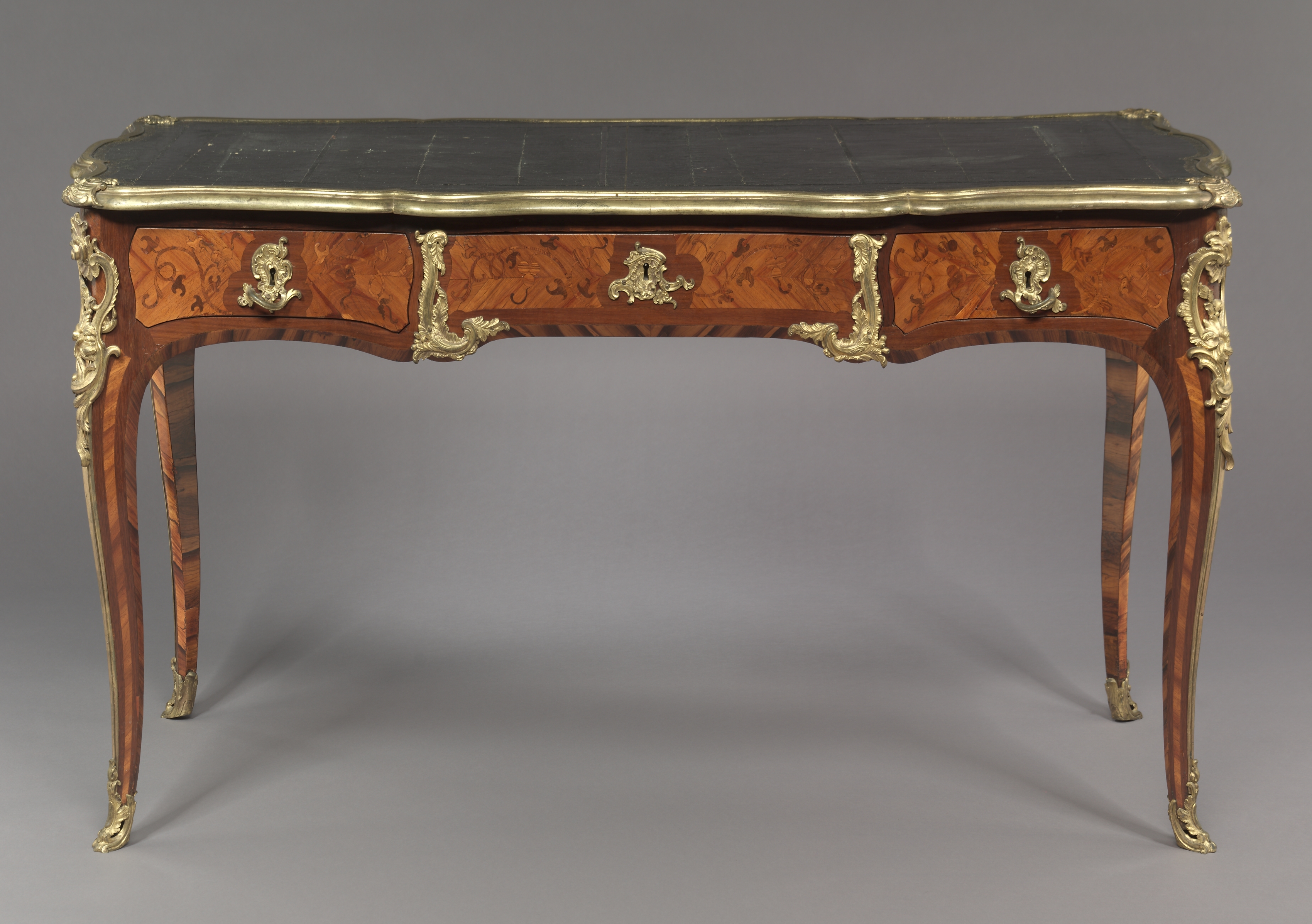 A long, low table with a black top and gold trim. The table has a wavy edge and four legs that curve outward. Three drawers are on the front, each with a gold handle. The table's body is made of wood with a marbled pattern. Gold accents adorn the legs, handles, and edges. The background is gray.