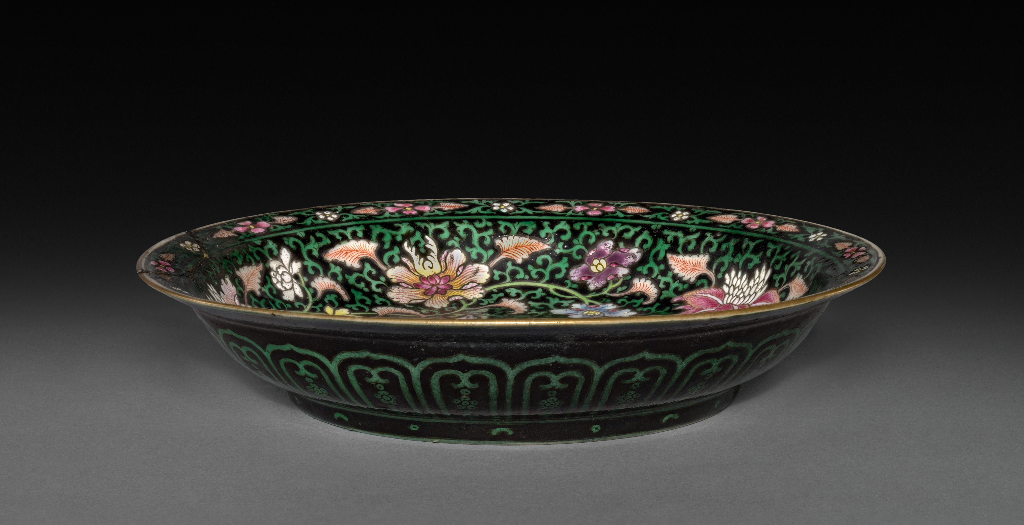 The image depicts a large, shallow bowl with a wide mouth. The bowl is predominantly black with a green design on the outside. The inside of the bowl features a dark green background adorned with colorful flowers and pink and white blooms. A gold rim encircles the top edge of the bowl. The background of the image transitions from black at the top to gray at the bottom, with the bowl casting a subtle shadow. The title of the image is "Dish".