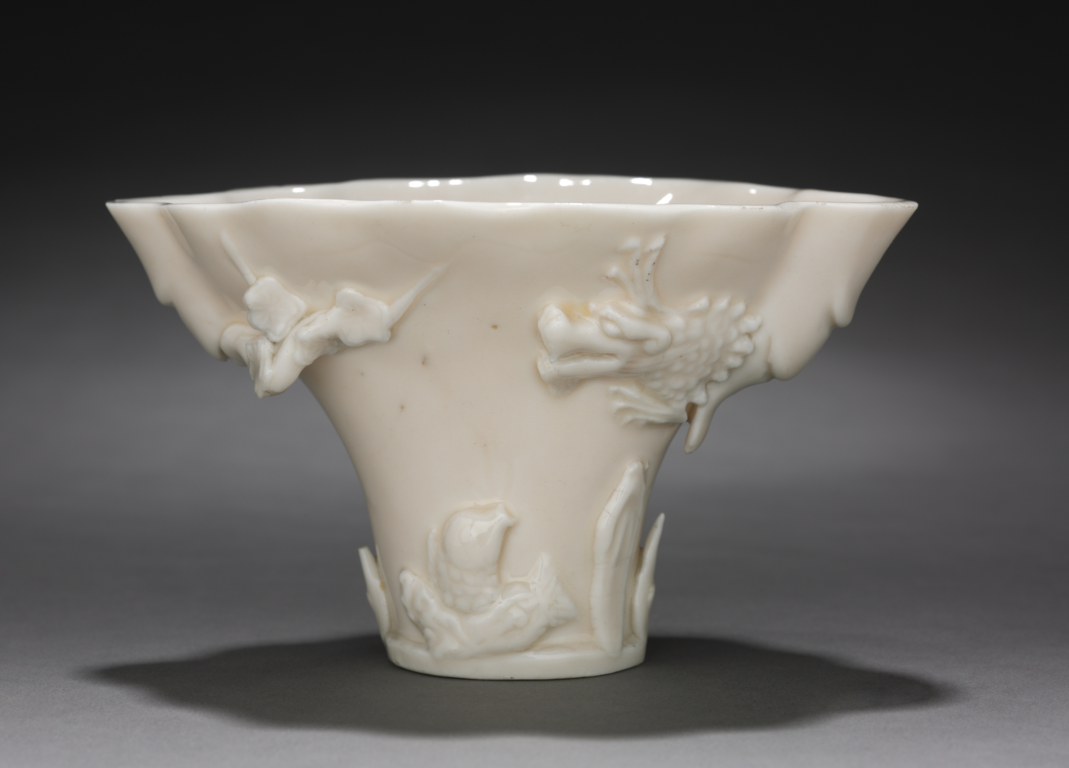 White ceramic cup with wide mouth and narrow base, featuring a dragon design. The cup has a glossy finish and appears to be made of porcelain or similar material. The dragon is depicted in relief on the side of the cup, facing right and appearing to be in motion. The interior of the cup is plain and smooth. The cup sits on a gray surface against a black background. Libation Cup by artist unknown.