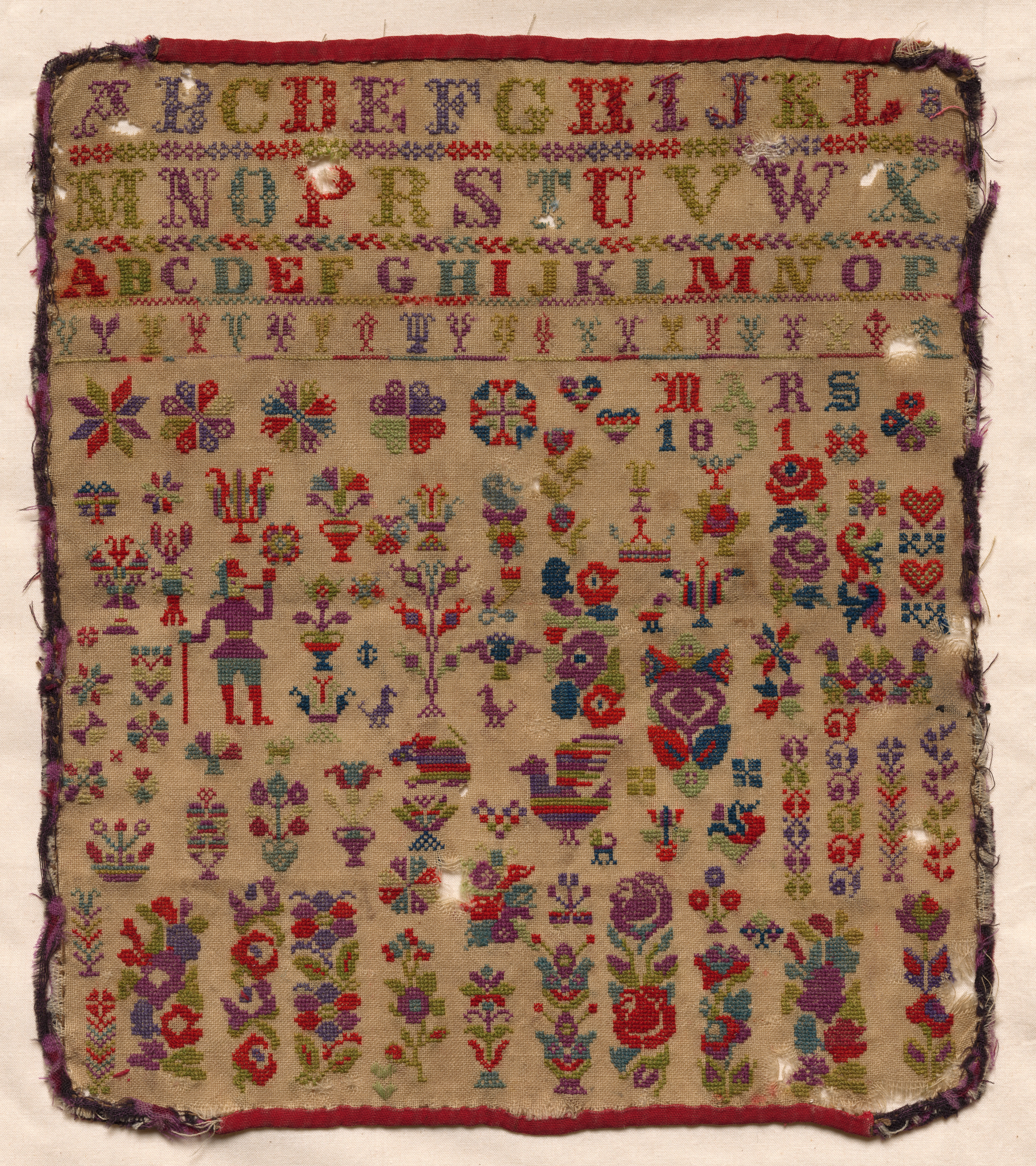 Tan fabric with a red border on top and bottom with purple on sides. The top section contains colorful alphabet letters in rows. The section below the alphabet section includes a row of flowers and other motifs. The bottom section includes colorful images of people, animals, plants, and flowers. The image is a sampler by an unknown artist.