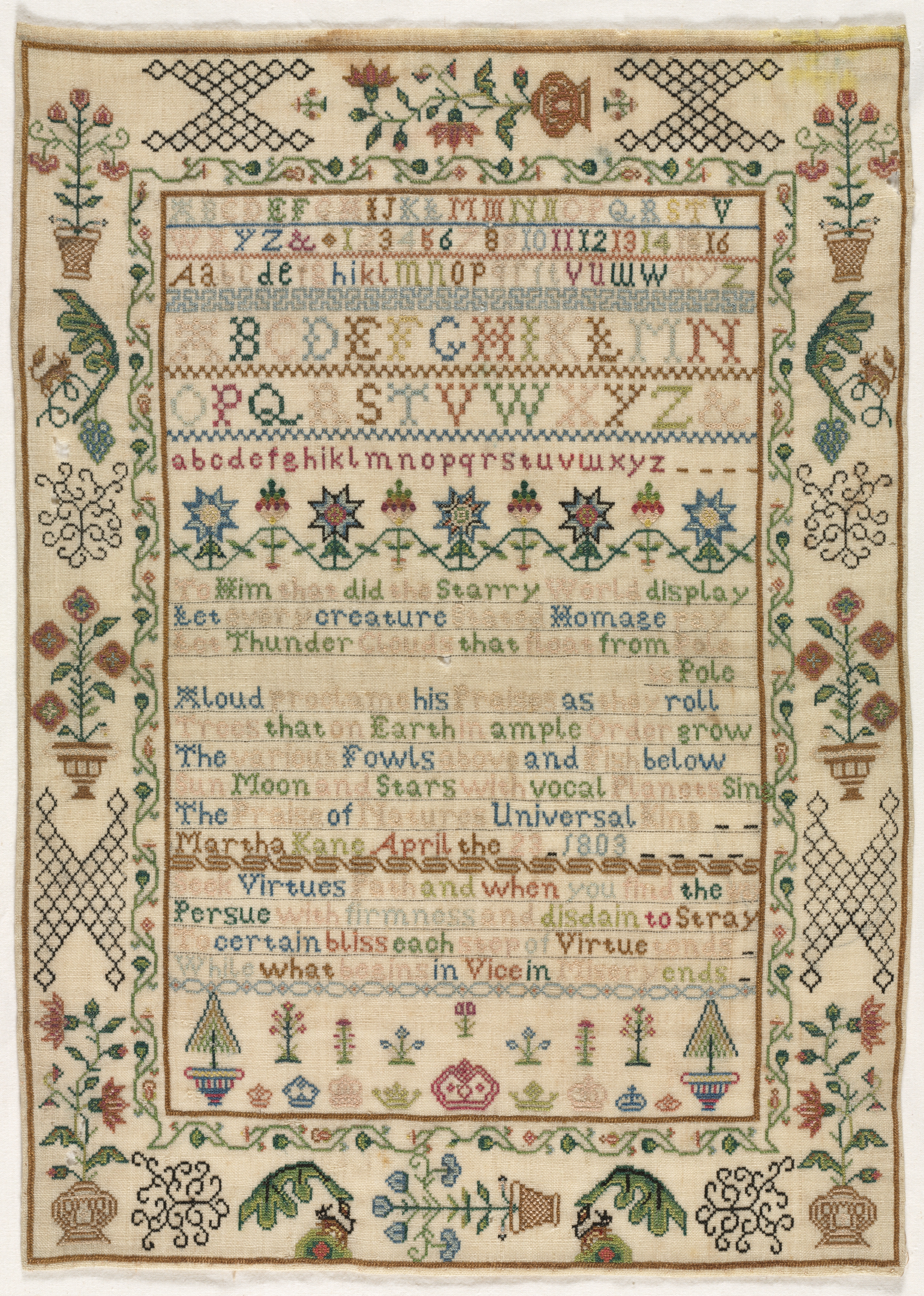 Tan fabric with a needlework alphabet sampler. The sampler has a large central rectangle containing rows of embroidered letters in various colors, numbers and a poem. The poem reads: "When God did the Starry display Let every creature from that Pole Loud as his roll that on Earth ample The grow Fowls below Moon and Stars with The vocal of net Sin Martha Kane Universal 1803 Virtues and when you find the the Persue firmness certain and disdain to Stray bliss each of what Virtue in Vice in". There are decorative borders around the central rectangle including flowers, leaves, potted plants and vases. The corners have crisscross patterns. There are 19 small potted plants and 2 vases along the bottom edge of the rectangle. The border on all four sides has green leaves and vines with flowers.