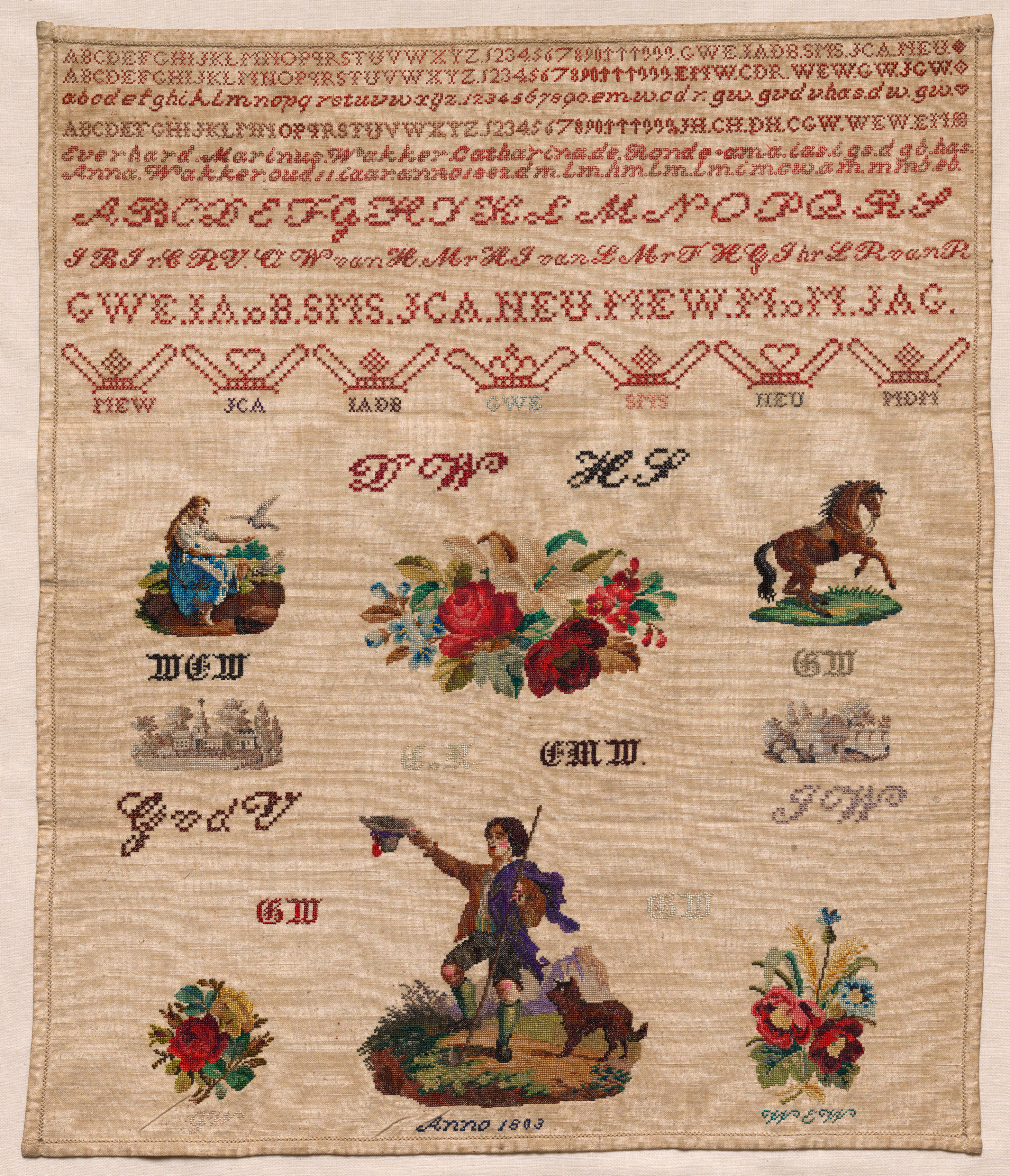Sampler by Anna Wakker. The image shows a rectangular piece of beige fabric with a stitched sampler. The top section features rows of red stitched text and symbols including the alphabet, numbers, and decorative designs. Underneath the top section, there are three rows of stitched images. The first row includes a woman in blue, a bouquet of flowers, and a brown horse. The second row features a castle, the word 'God', and another castle. The third row shows a floral arrangement, a man with a dog, and another floral arrangement. The images and text are stitched in various colors, including red, blue, green, brown, and black. The sampler includes the date Anno 1803.
