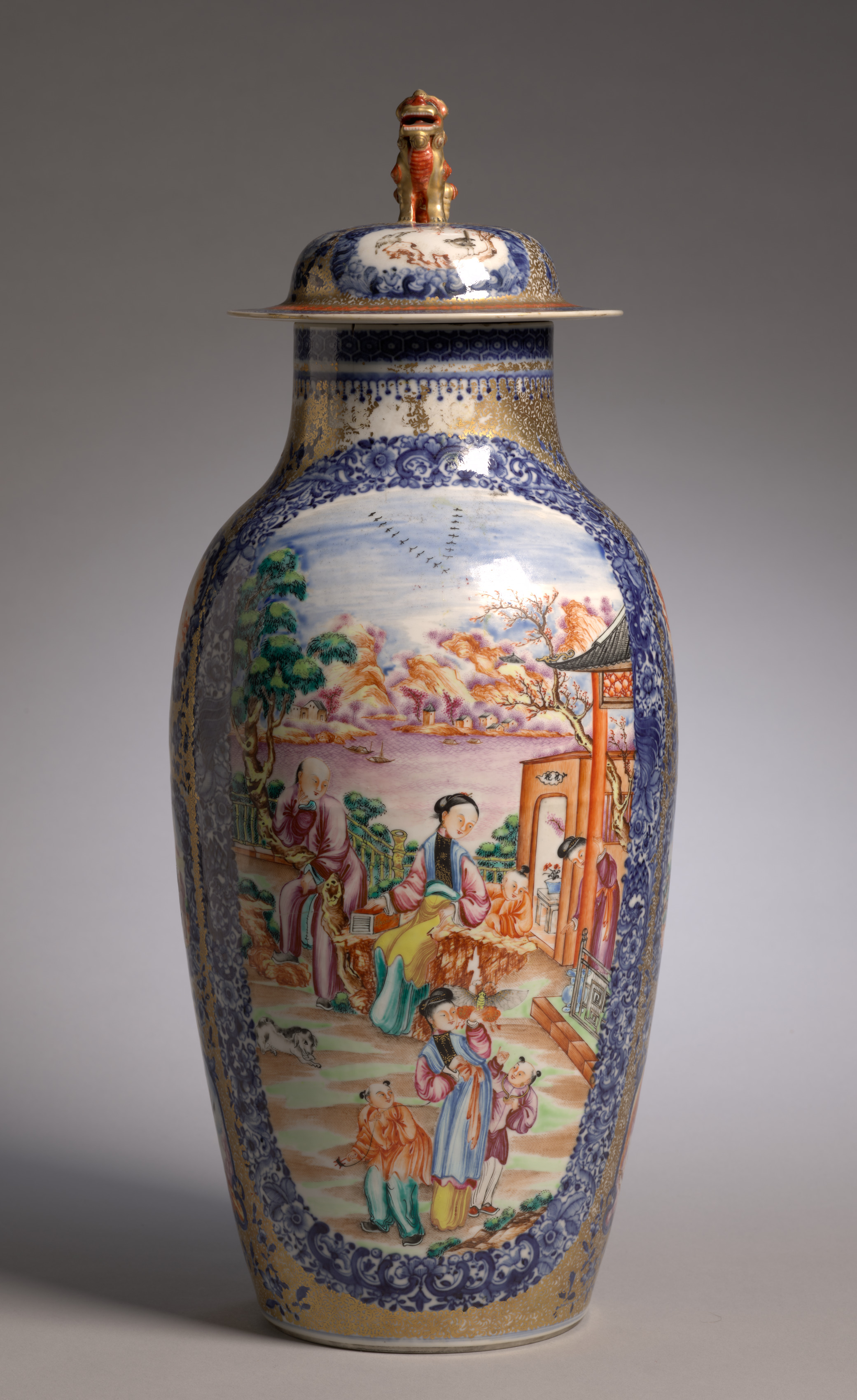 The image shows a vase with a colorful scene on it. The vase is white with blue, gold and colorful designs. The vase is shaped like an hourglass. The top of the vase tapers in and has a small lid with an animal on top. The scene on the vase depicts several people in traditional clothing sitting and standing. The people are surrounded by trees, buildings, and mountains in the background. The scene is bordered by blue and gold designs. The background of the image is gray. The title of the image is Covered Vase by artist Royal Worcester.