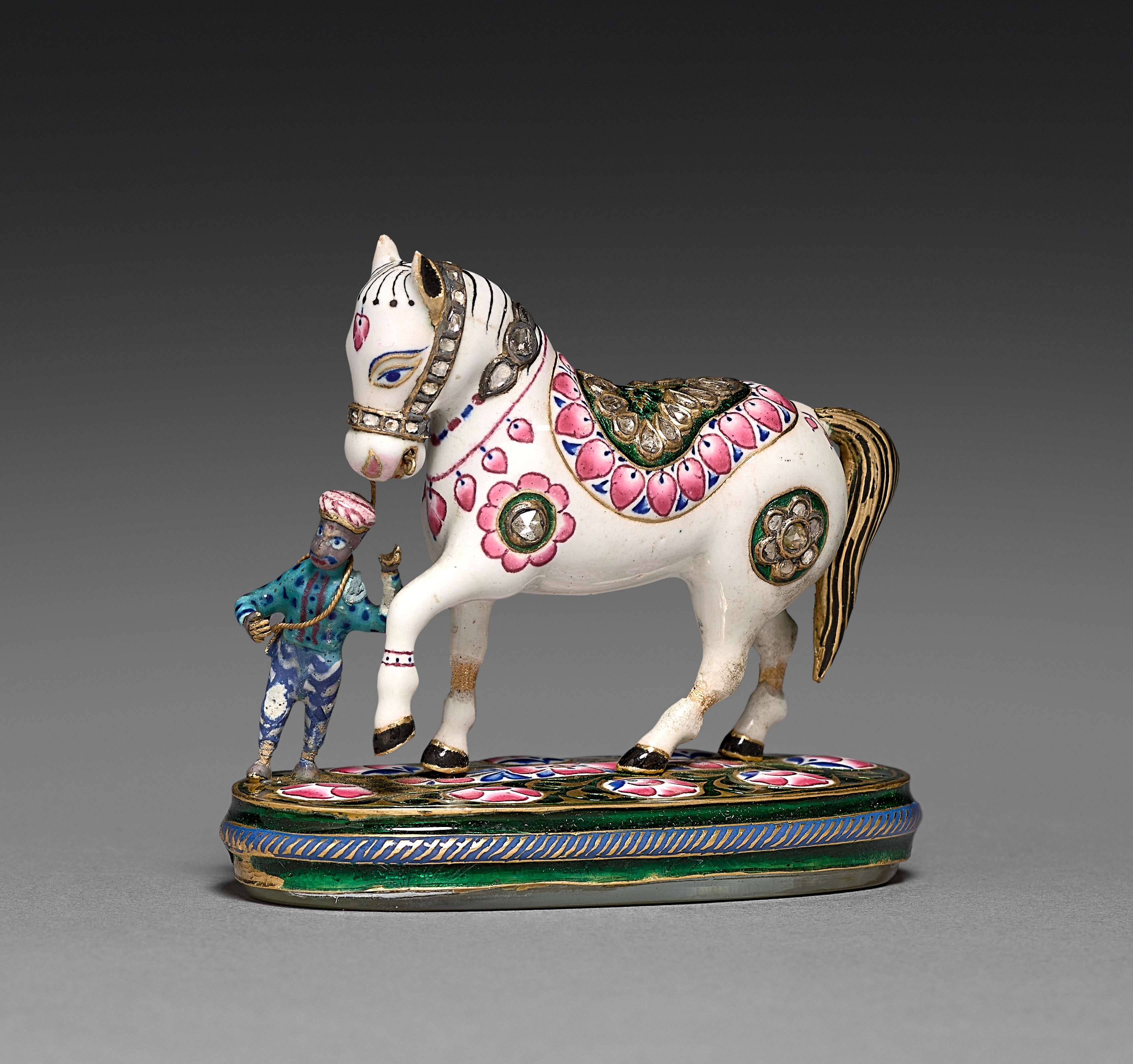 White horse figurine with pink flowers and gold accents, standing on a green and gold base with pink flowers; a small human figurine stands to the left; horse's head has a mirror attached. The figurine is Lady's Hand Mirror with Horse as Handle. The artist is uncertain.