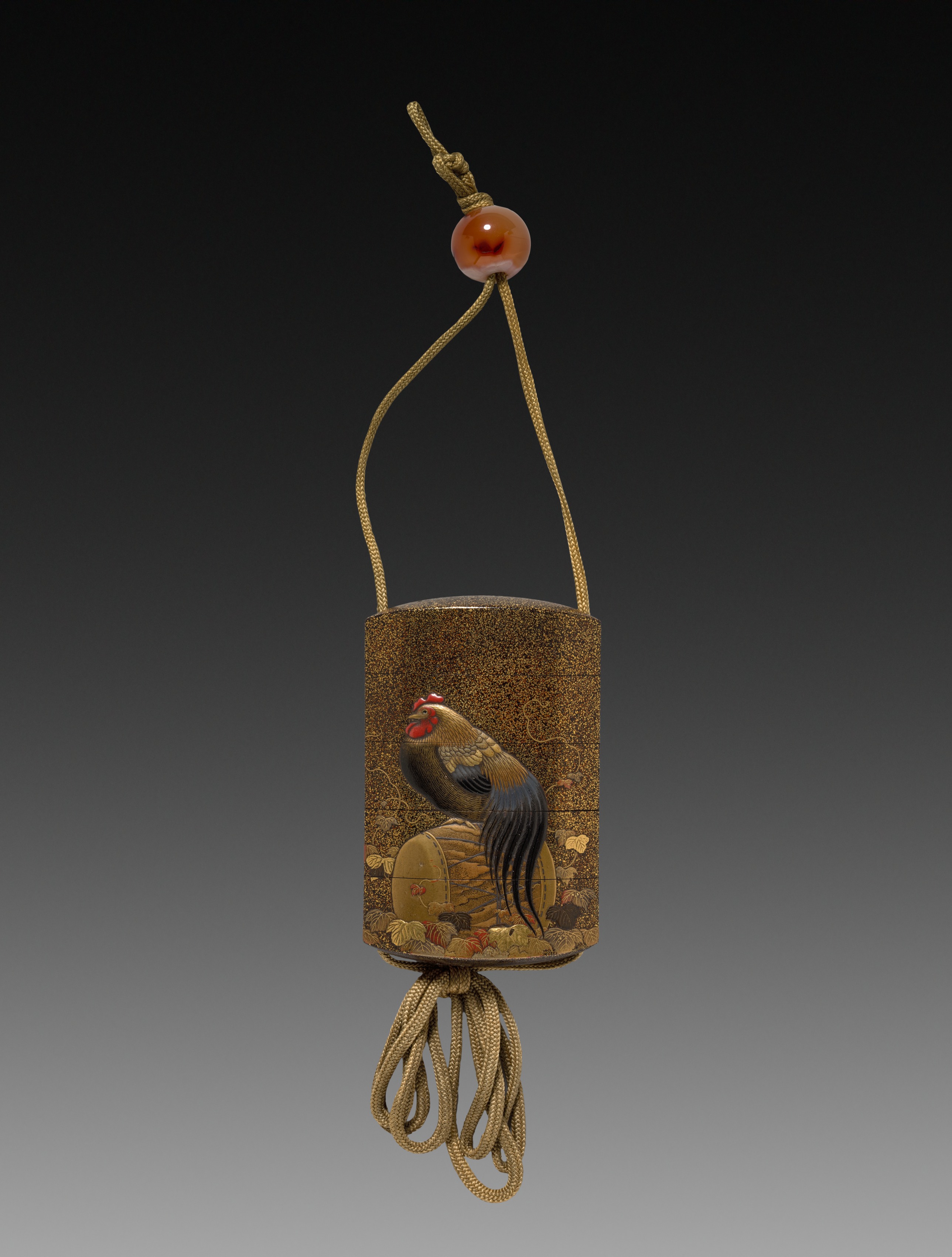 Cylindrical object with a brown and gold color; a rooster on the front; attached to a cord with a large brown bead; tassel. Inro. Artist not specified.