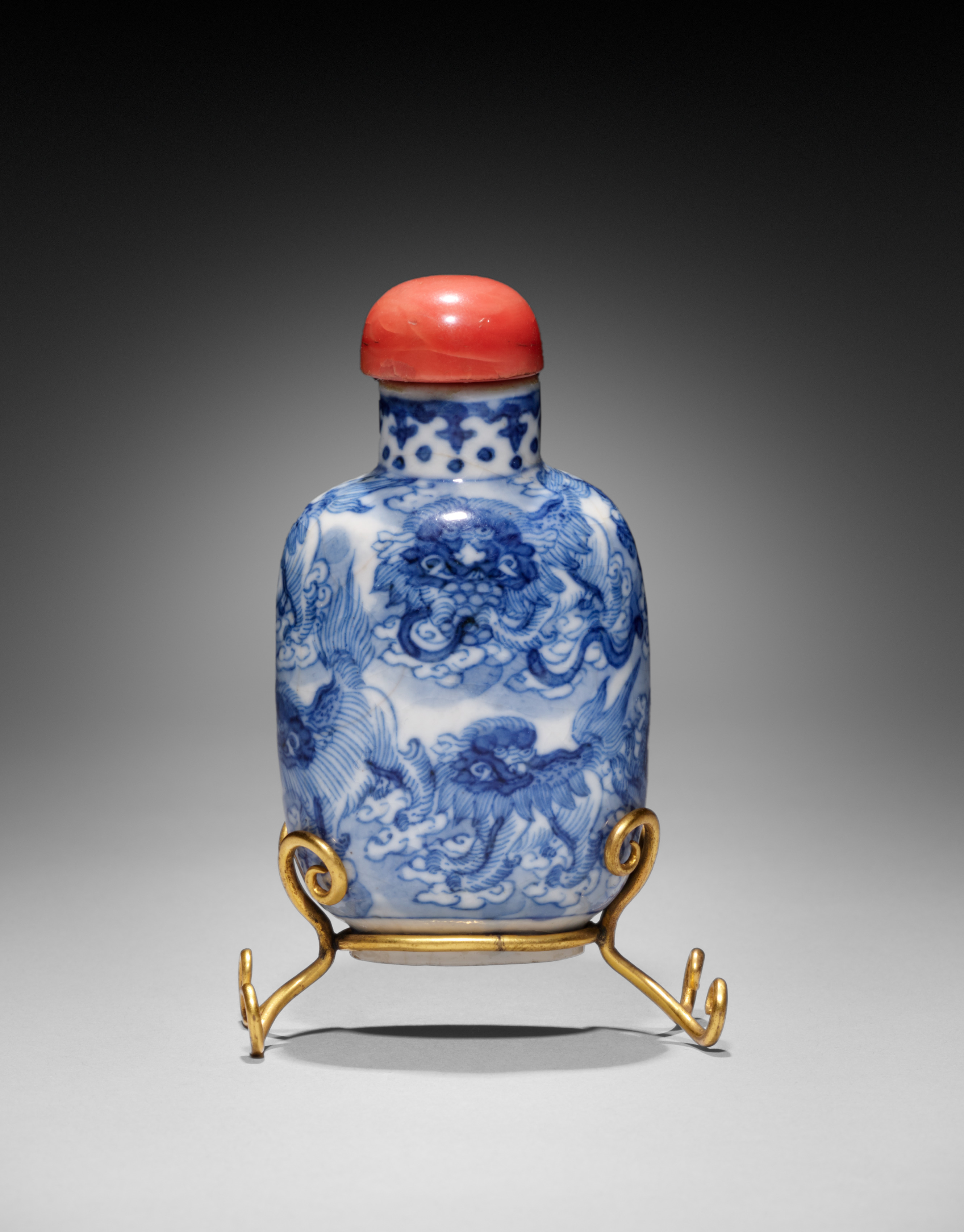Flattened ovoid snuff bottle with stopper; blue and white; gold stand. The snuff bottle has a rounded, flattened ovoid body. The body is white with blue underglaze decoration. The blue decoration depicts scenes with dragons. The bottle has a short cylindrical neck. The base of the neck is decorated with a band of blue underglaze. The stopper is red. The snuff bottle sits on a gold-colored metal stand with four legs. The background is dark at the top and light at the bottom.