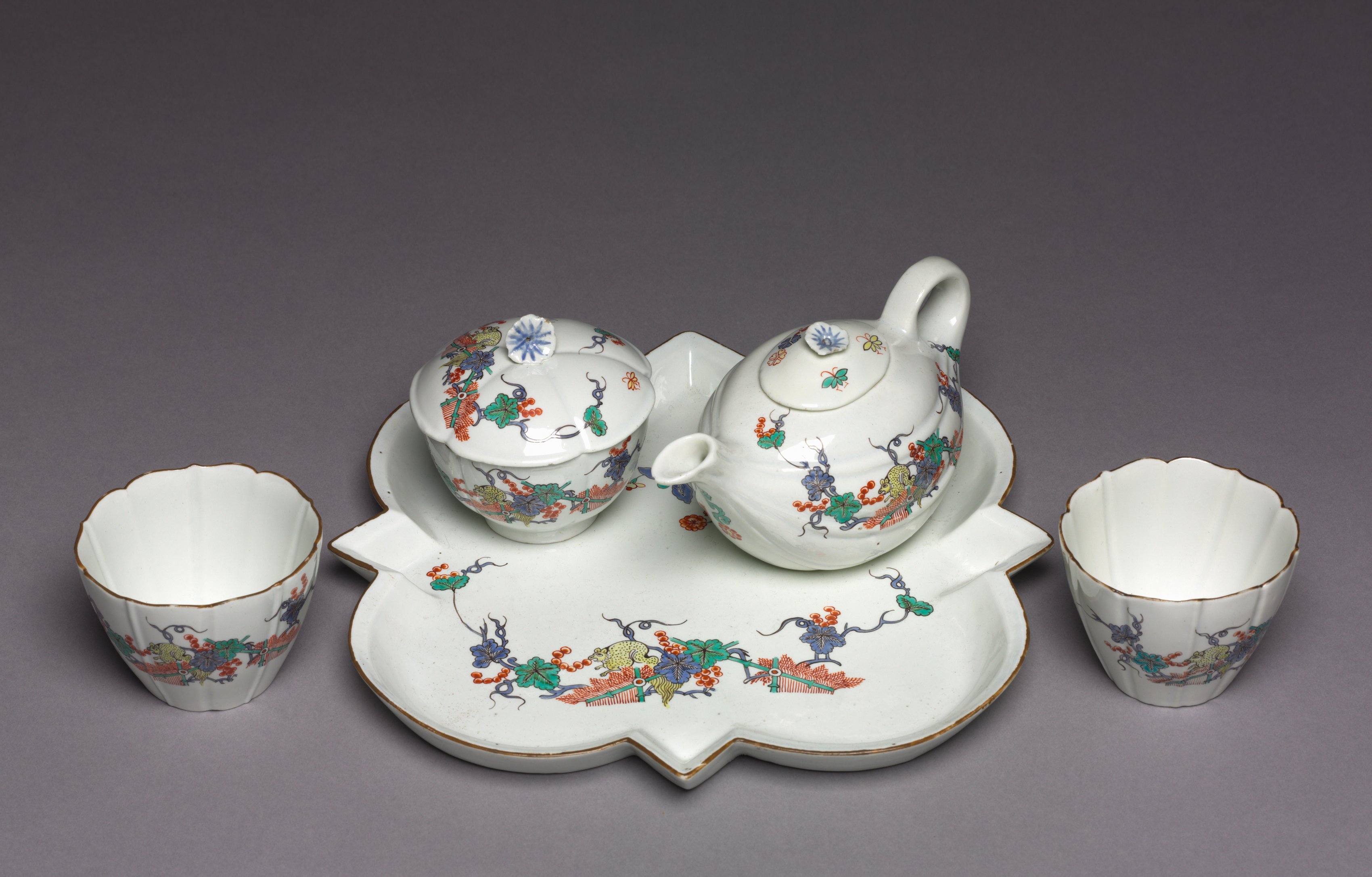 White porcelain tea service set on a gray background. The set includes a teapot, a covered sugar bowl, a large serving tray, and two small cups. All pieces have a scalloped edge and are decorated with colorful floral designs and gold trim. The teapot has a small handle and a knob on top. The sugar bowl has a small knob on top. The large serving tray has a flower-shaped design with pointed sections that extend outwards. The two small cups are positioned on either side of the serving tray. All pieces have a glossy finish. The floral designs feature blue, green, red, orange and purple colors.