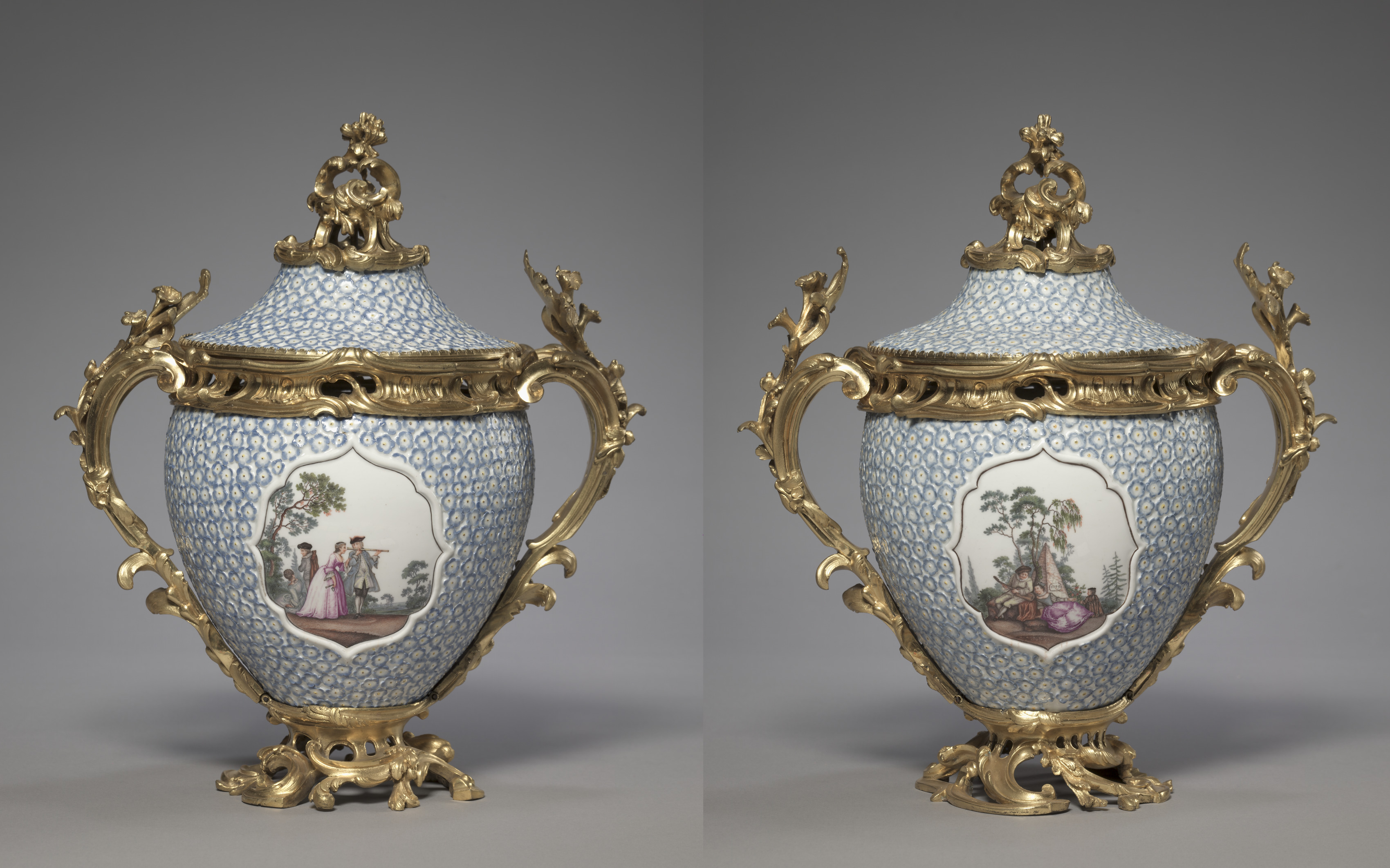 Two light blue and white porcelain vases with gold accents, the vases are identical. The porcelain is light blue with a small white dot pattern. The vases have two handles on either side, and a lid on top. The handles and lids are gold colored. The vases have a white oval on the front with a painted image. On the left vase, the image depicts three people standing outside near a tree and a fence. On the right vase, the image depicts two people sitting on a bench surrounded by trees. The vases are sitting on a gray background. The vases have a gold base. The lids have a gold finial on top. The handles are ornate and have a floral design.