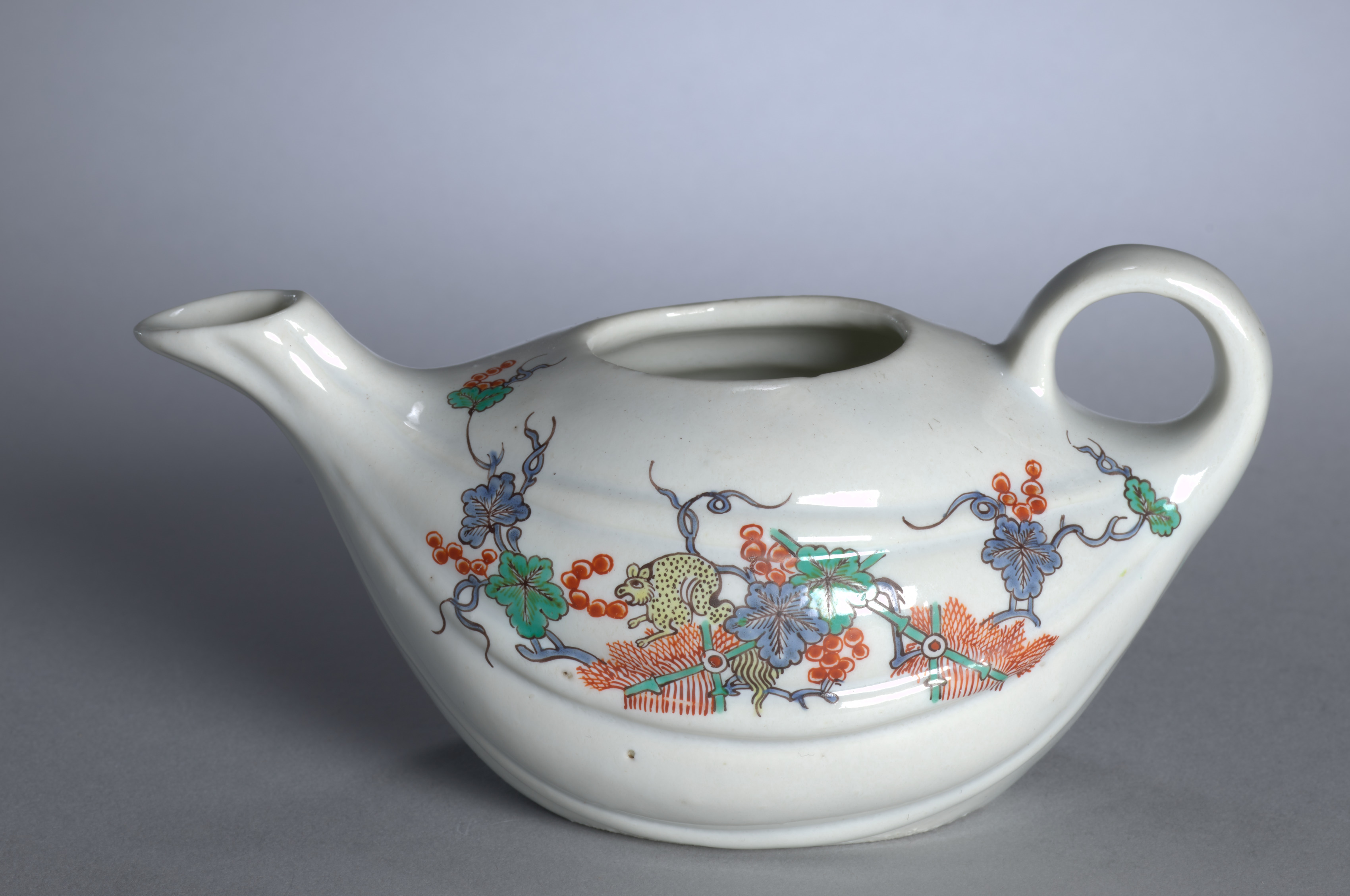 White teapot with a handle on one side and a spout on the other. The body of the teapot is rounded and has a wide, shallow shape. A colorful design wraps around the middle of the teapot featuring blue flowers, green leaves, red berries, and a yellow animal with black spots. The background of the image is gray.